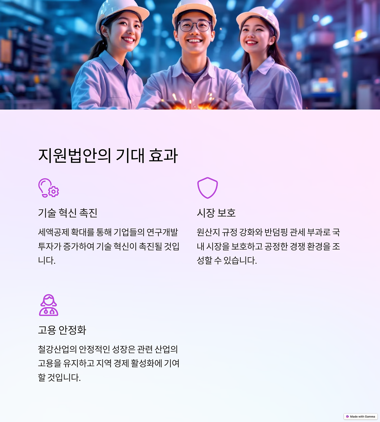 | 철강산업 연구개발 및 설비 투자 부담 완화 | 저가 수입 철강 제품으로부터 국내 시장 보호 | 최대 38% 관세 부과로 가격 경쟁력 확보 |