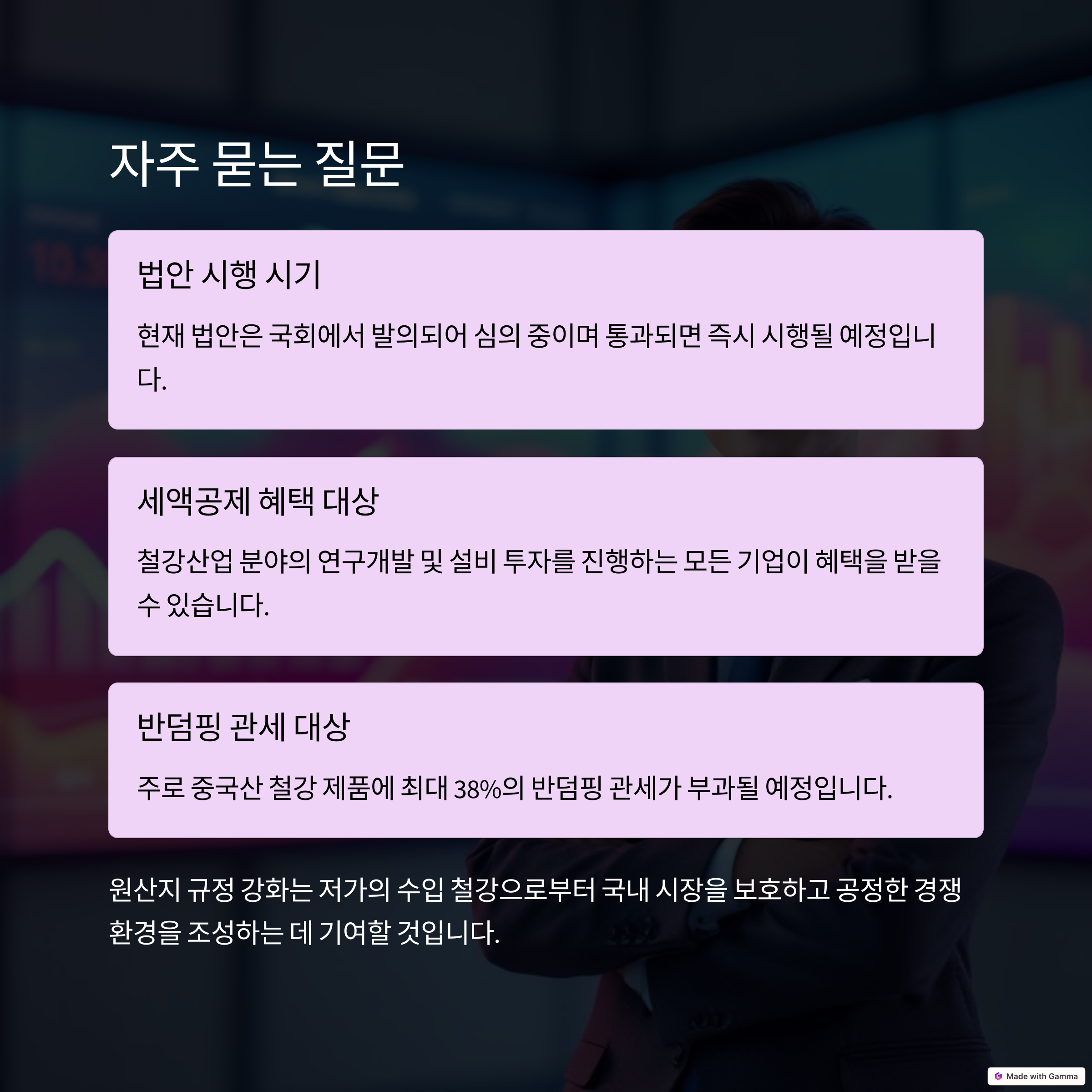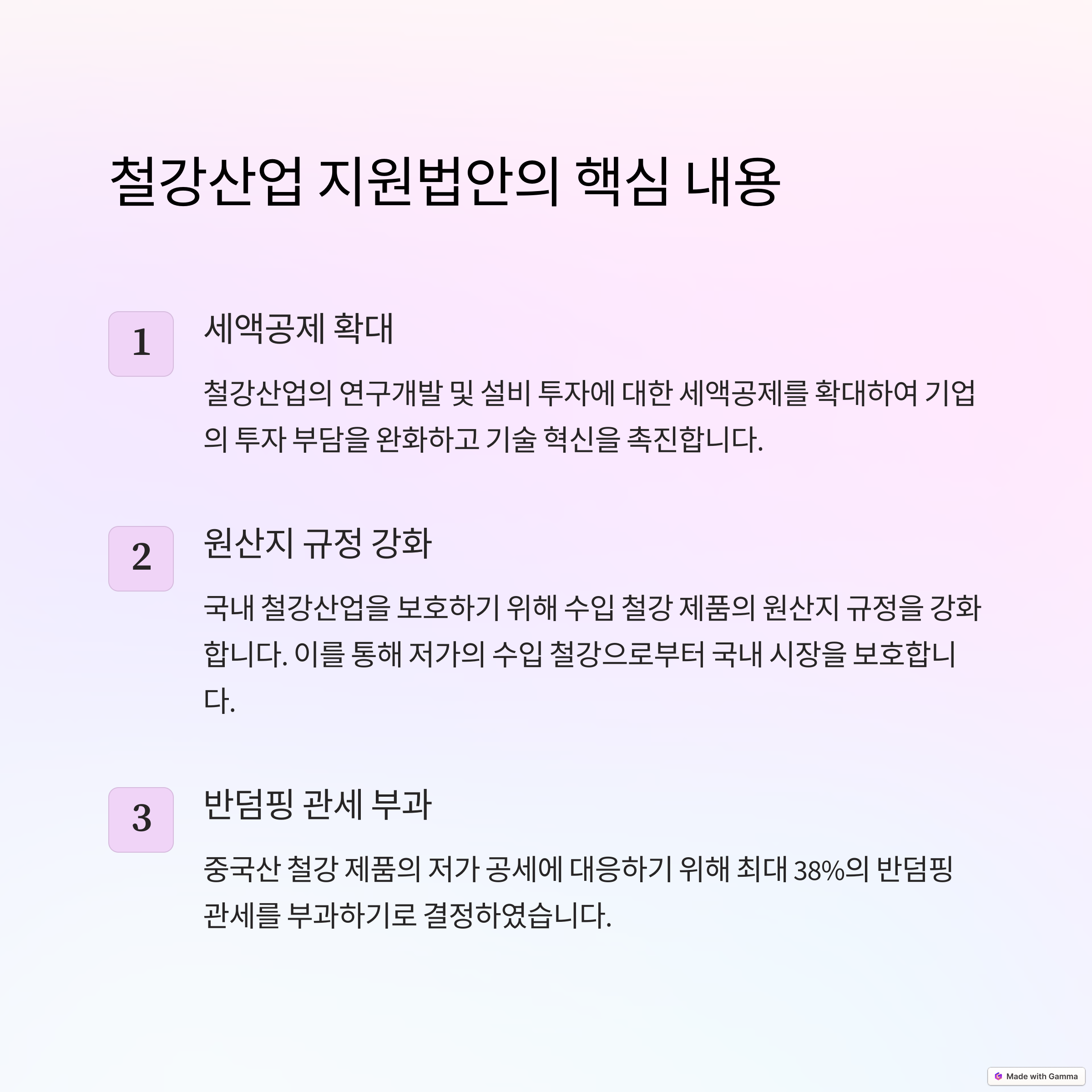 최근 발의된 철강산업 지원법안은 다음과 같은 주요 내용을 포함하고 있습니다. 첫째, 철강산업의 연구개발 및 설비 투자에 대한 세액공제 확대가 핵심 내용 중 하나입니다. 기업이 최신 기술을 도입하고 생산 효율성을 높일 수 있도록 세액공제 폭을 늘려 기업의 투자 부담을 완화하고자 합니다. 둘째, 수입 철강 제품의 원산지 규정을 강화하여 국내 철강산업 보호에 나섭니다. 저가의 수입 철강이 국내 시장에서 불공정 경쟁을 일으키는 것을 막고 국내 기업들이 안정적으로 경쟁할 수 있는 기반을 마련하게 됩니다. 셋째, 중국산 철강 제품의 저가 공세에 대응하기 위해 최대 38%의 반덤핑 관세를 부과하기로 하였습니다. 이는 국내 철강 기업의 가격 경쟁력을 유지하고 불공정 무역 관행을 방지하는 데 기여할 것입니다.