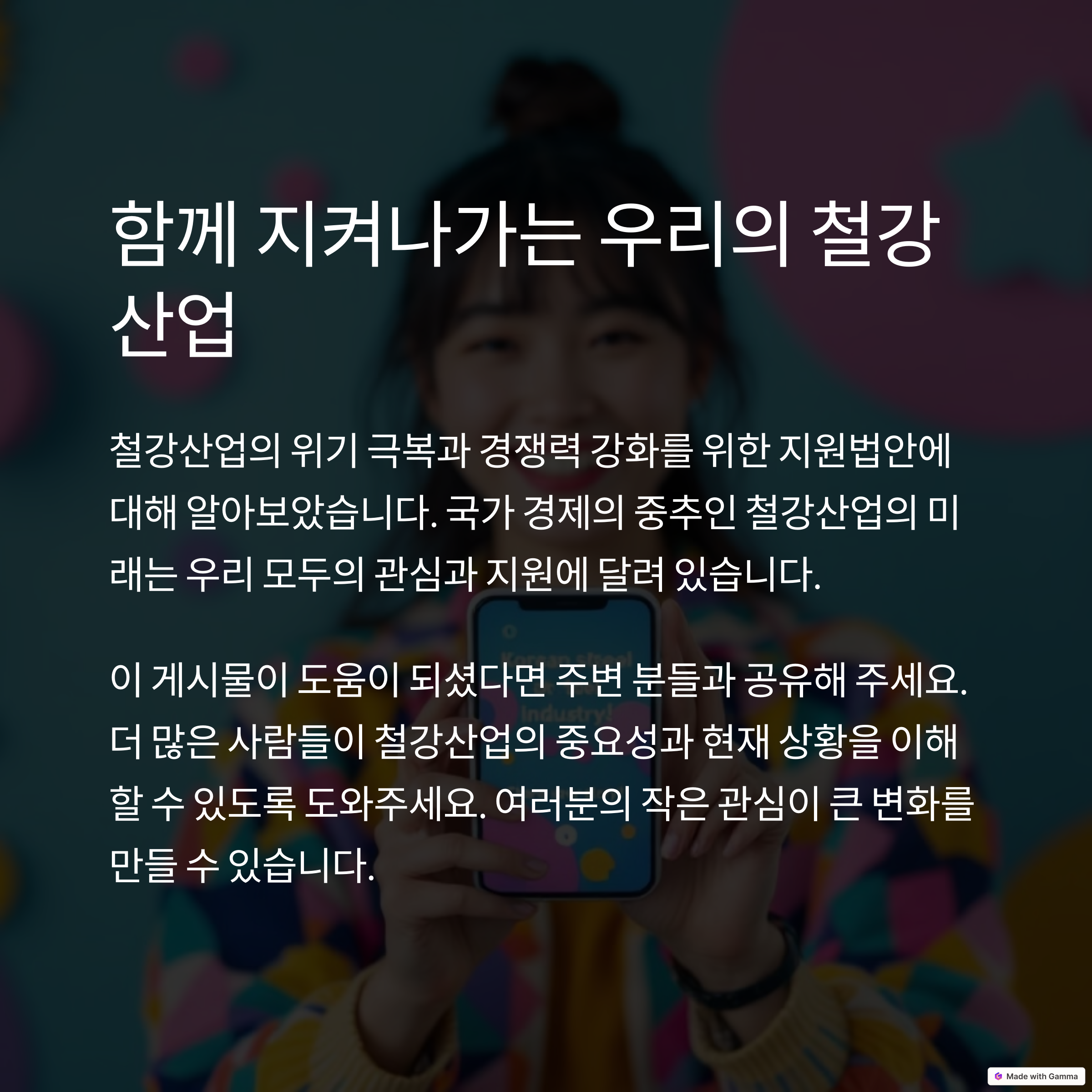 이번 철강산업 지원법안은 국내 철강산업의 경쟁력을 강화하고 지속 가능한 성장을 도모하기 위한 중요한 전환점이 될 것입니다. 정부와 국회의 적극적인 지원과 기업들의 노력이 함께한다면 국내 철강산업이 세계 무대에서 다시 빛을 발할 수 있을 것입니다. 앞으로도 지속적인 관심과 지원이 필요하며, 우리 모두의 노력이 함께할 때 진정한 변화가 이루어질 것입니다.