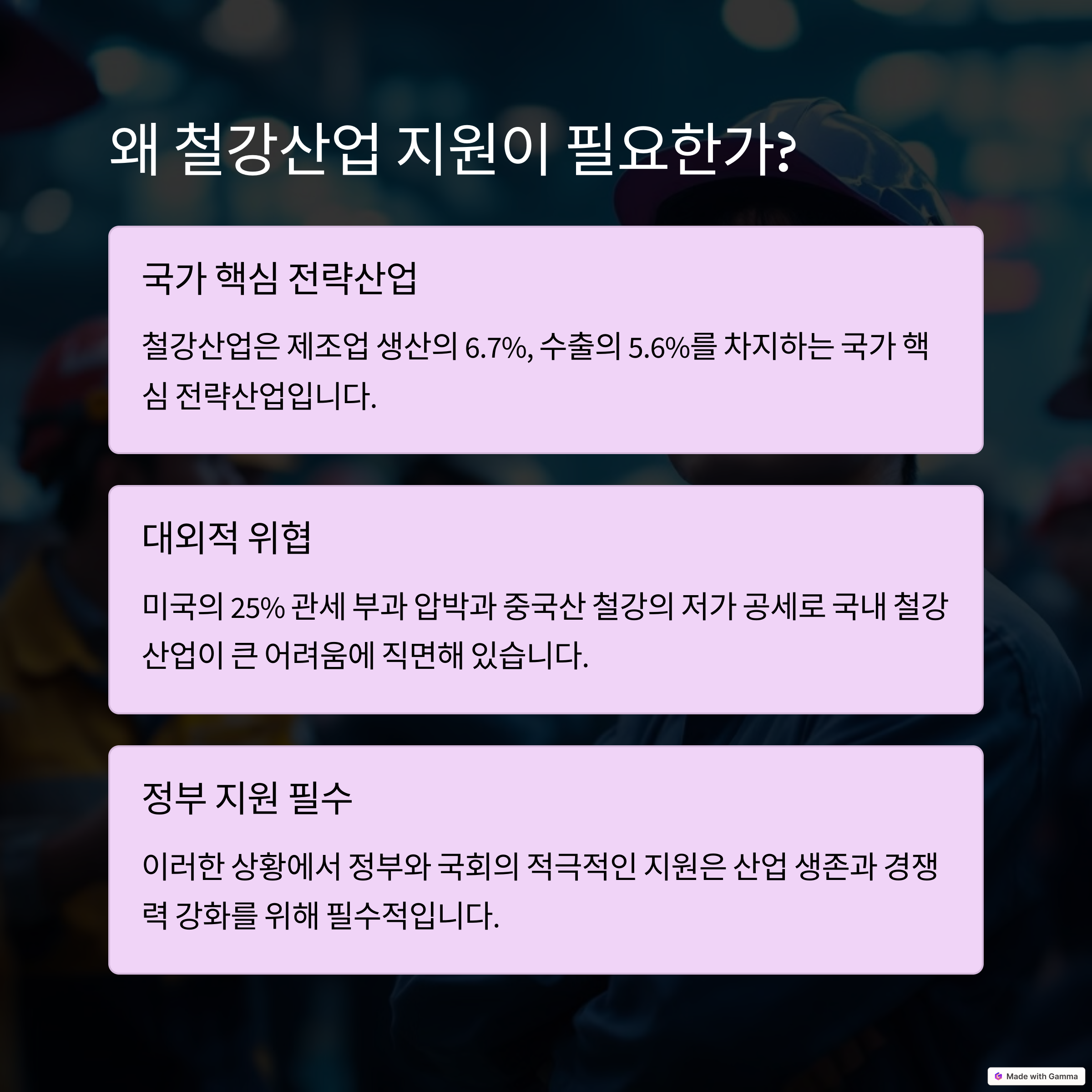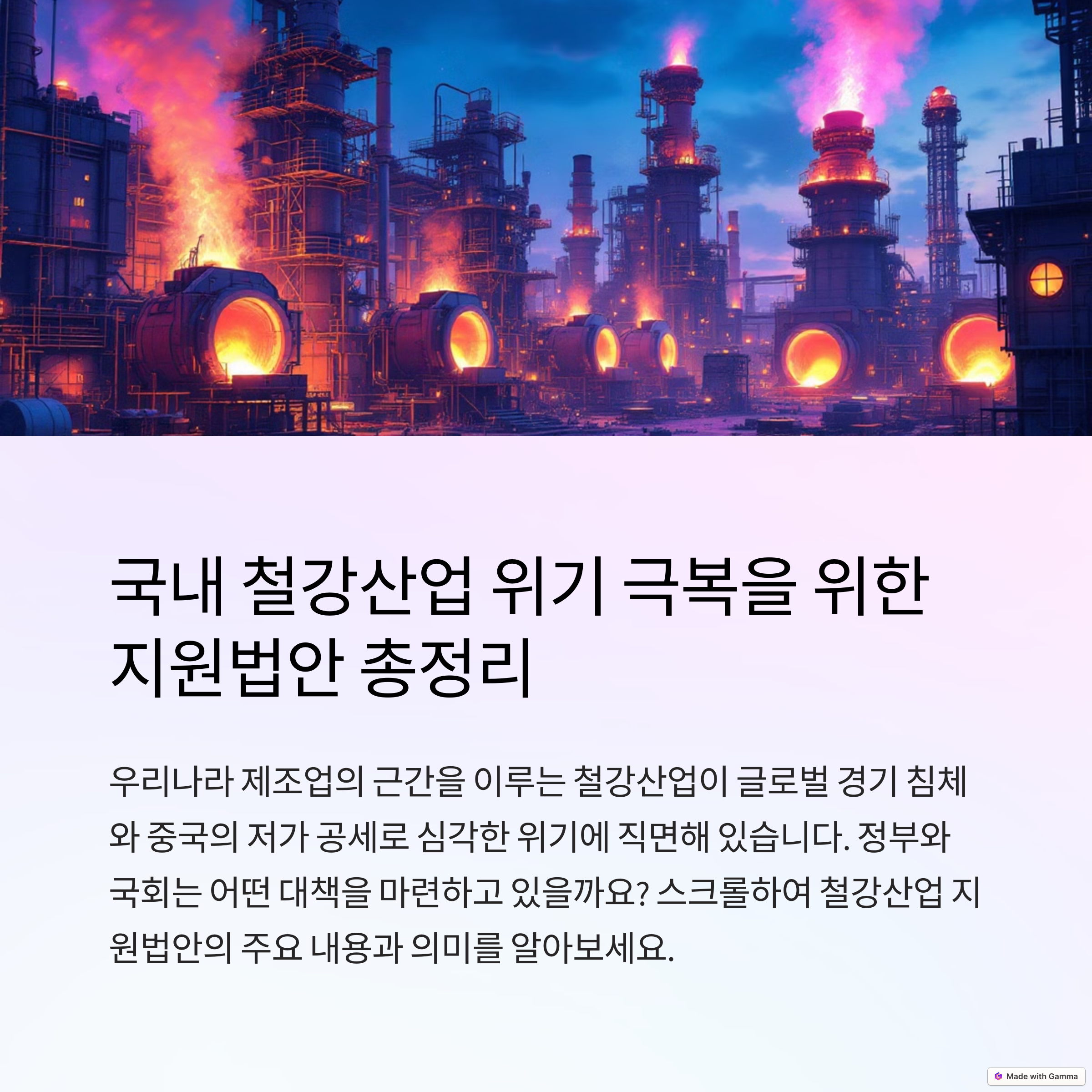 최근 글로벌 경기 침체와 중국의 저가 공세로 인해 국내 철강산업이 큰 위기에 직면해 있습니다. 철강산업은 우리나라 제조업의 근간을 이루는 핵심 산업으로, 국내 제조업 생산의 6.7%, 수출의 5.6%를 차지할 정도로 중요한 역할을 담당하고 있습니다. 그러나 미국의 25% 관세 부과 압박과 중국산 철강 제품의 저가 공세로 국내 철강 기업들은 심각한 경쟁력 약화를 겪고 있습니다. 이에 정부와 국회는 국내 철강산업의 경쟁력을 강화하고 지속 가능한 성장을 도모하기 위해 다양한 지원 법안을 마련하고 있습니다. 이번 글에서는 이러한 법안들의 주요 내용과 기대 효과를 상세히 살펴보겠습니다.