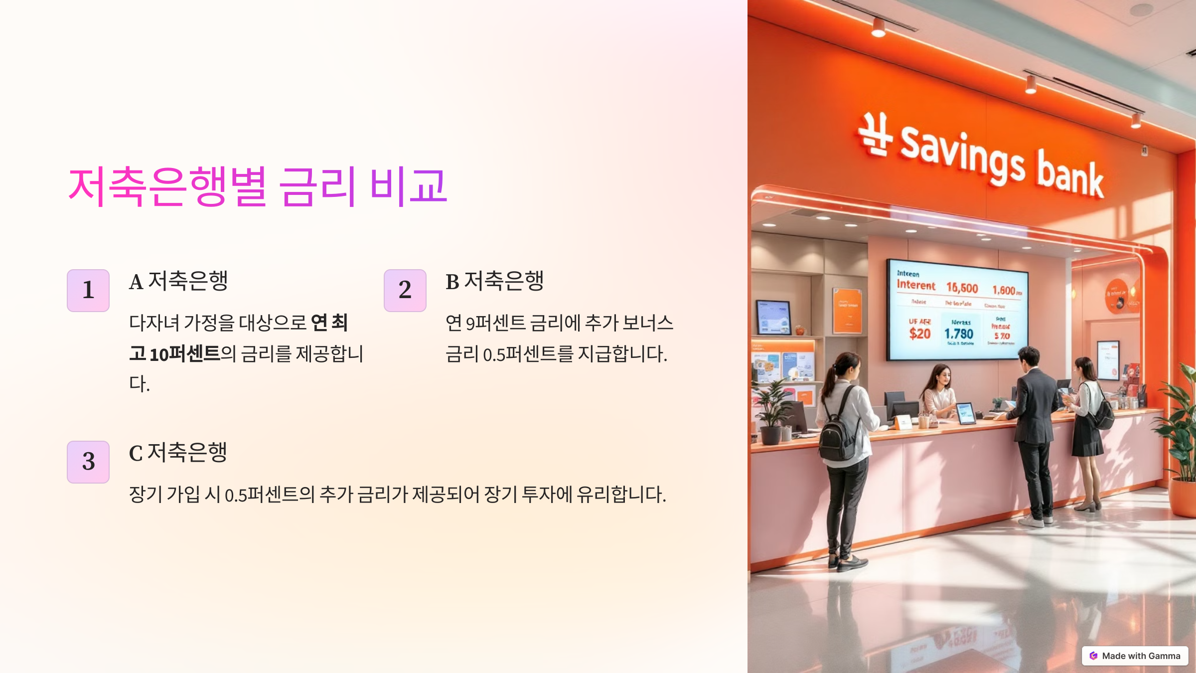 예를 들어, A 저축은행은 다자녀 가정을 대상으로 연 최고 10퍼센트의 금리를 제공하고 있으며, B 저축은행은 연 9퍼센트 금리에 추가 보너스 금리 0.5퍼센트를 지급하고 있습니다. C 저축은행의 경우 장기 가입 시 0.5퍼센트의 추가 금리가 제공되어 장기 투자에 유리합니다. 이처럼 저축은행별 상품 특성을 파악하고 자신의 재정 상황에 맞는 상품을 선택해야 합니다.