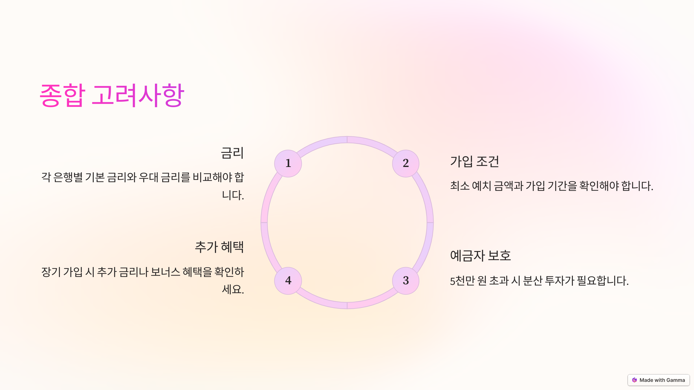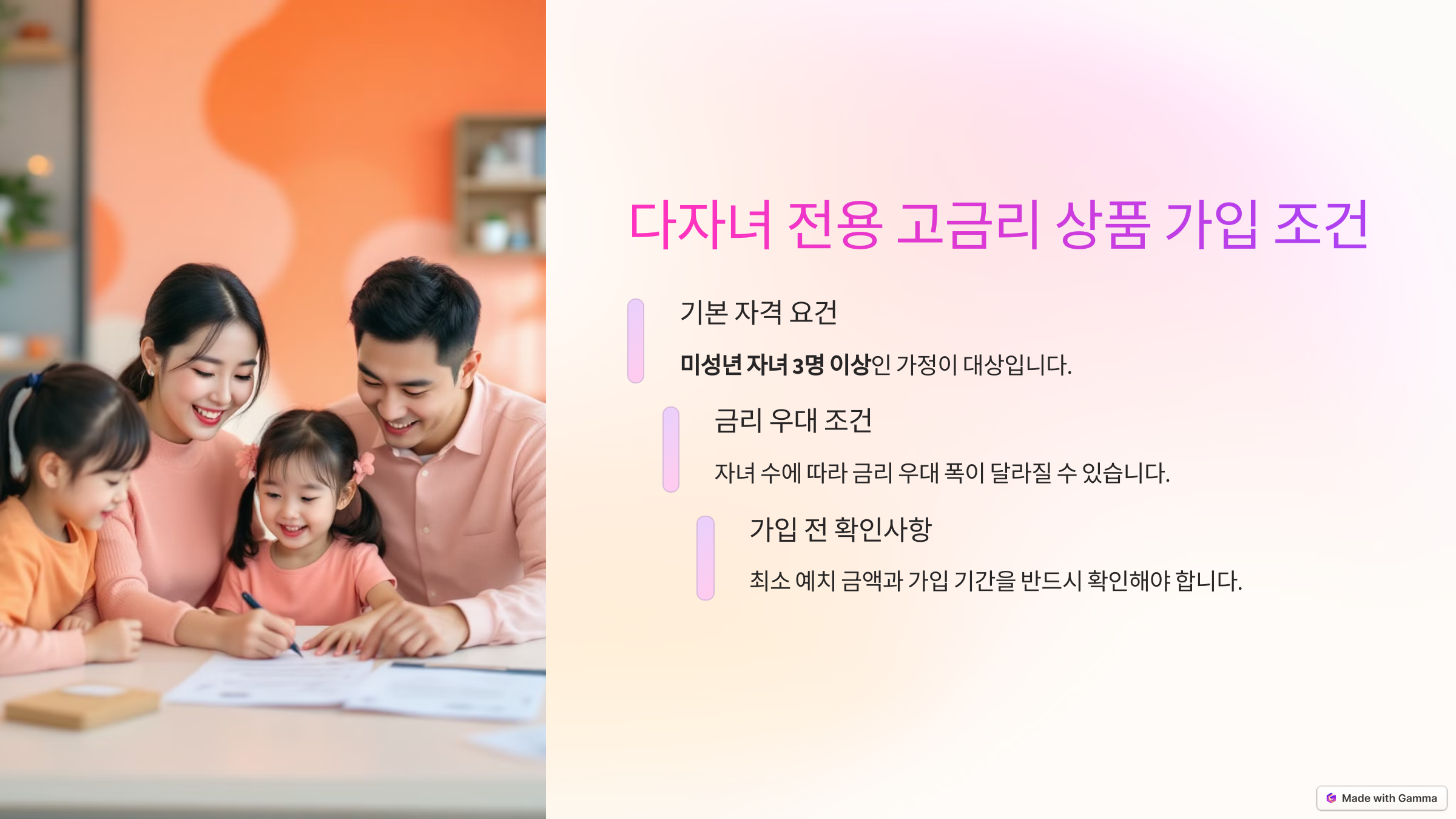 다자녀 가정을 위한 고금리 저축상품은 금리뿐만 아니라 가입 조건, 예금자 보호, 추가 혜택 등을 종합적으로 고려해야 합니다. 각 저축은행별 상품 특성을 파악하고 자신의 자금 상황에 맞는 상품을 선택하면 높은 금리와 함께 다양한 금융 혜택을 누릴 수 있습니다.