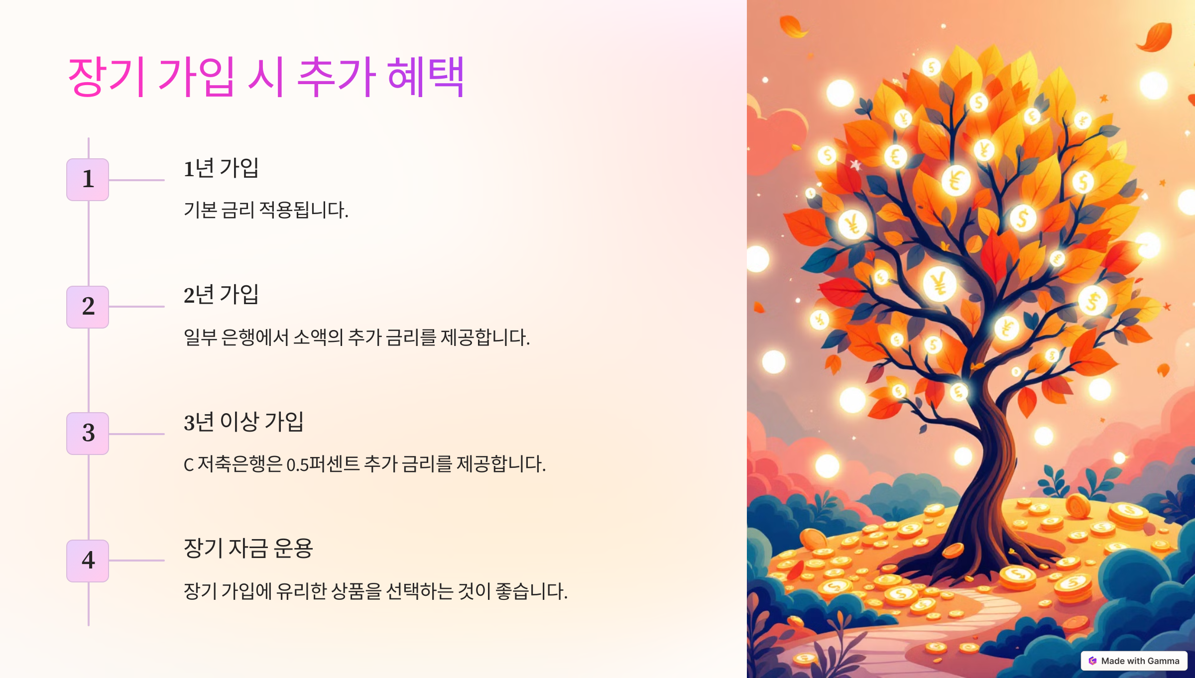 | C 저축은행 | 연 8% | 장기 가입 시 0.5% 추가 금리 |