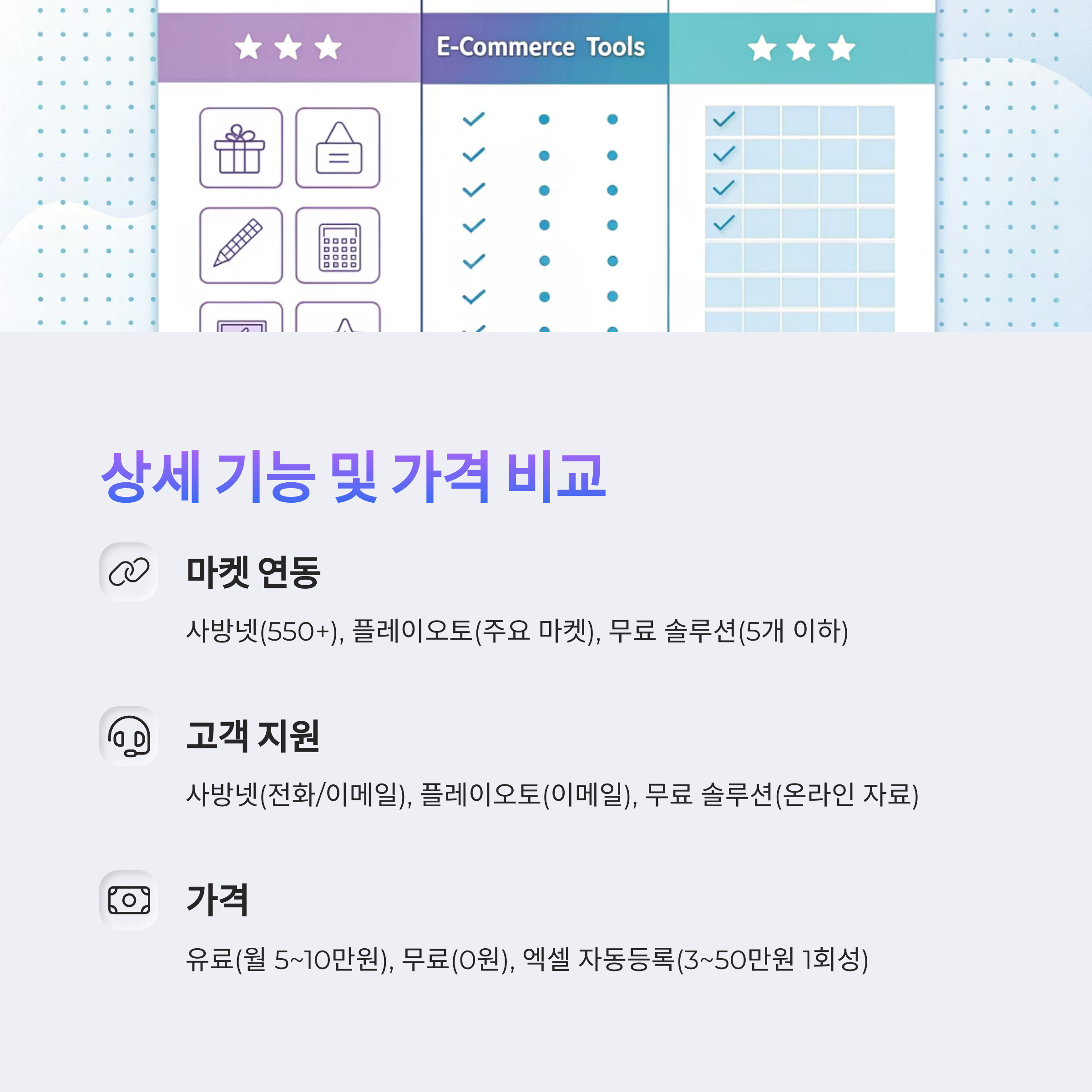 | 마켓 연동 | 550여 쇼핑몰, 통합관리 | 주요 오픈마켓 중심 | 일부 마켓 위주 | 5개 마켓 동시 등록 | 스마트스토어만 가능 |