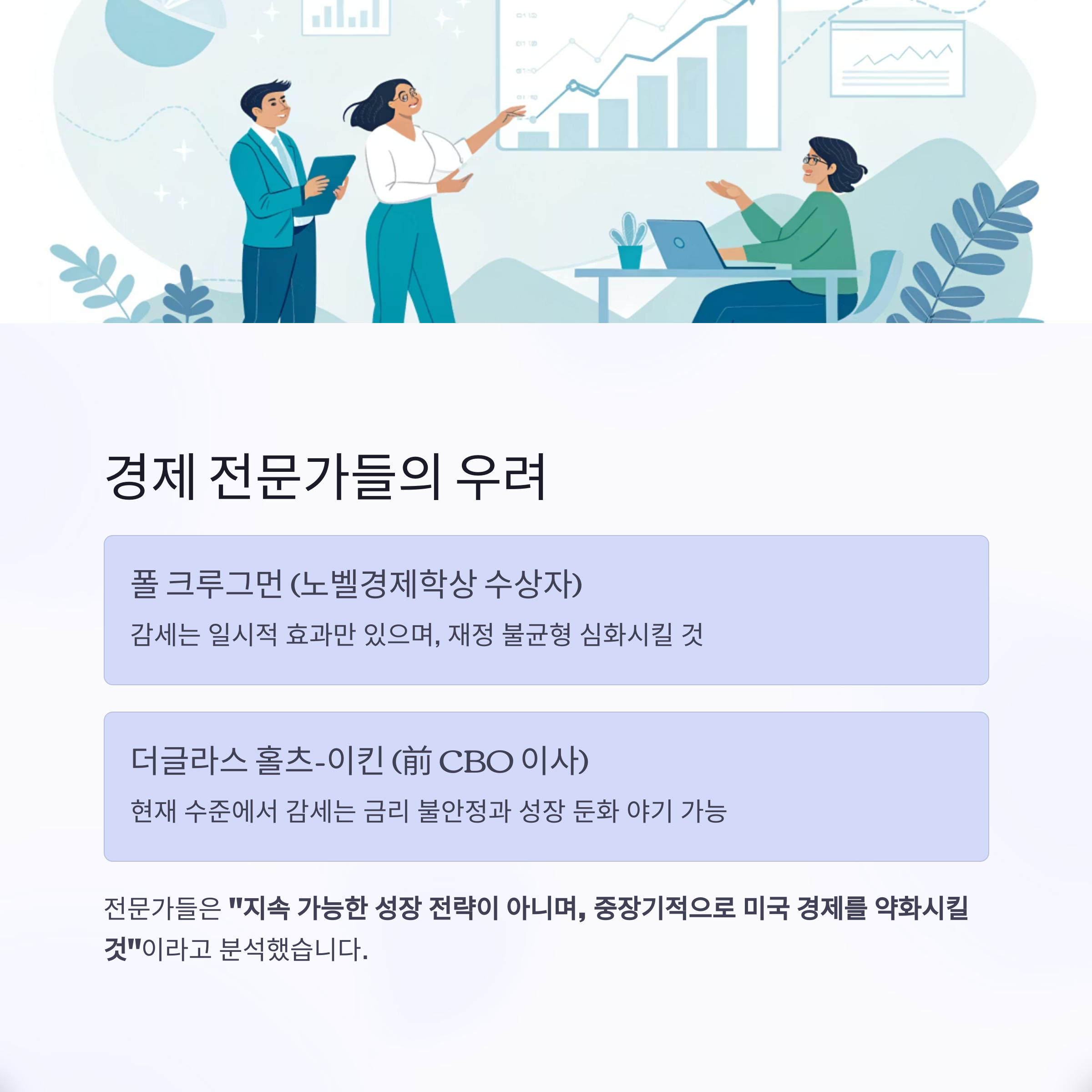 | 더글라스 홀츠-이킨 (前 CBO 이사) | 현재 수준에서 감세는 금리 불안정과 성장 둔화 야기 가능 |
