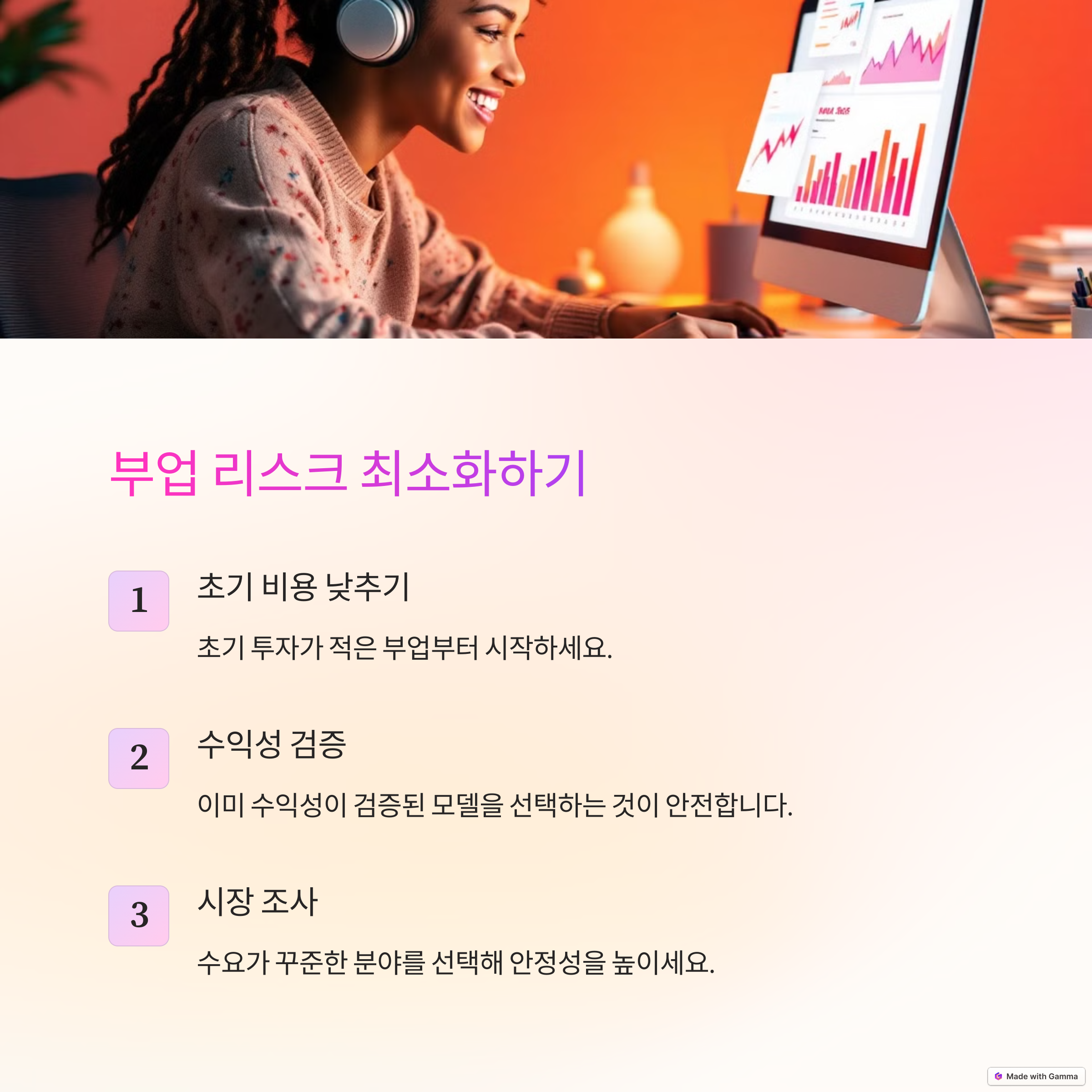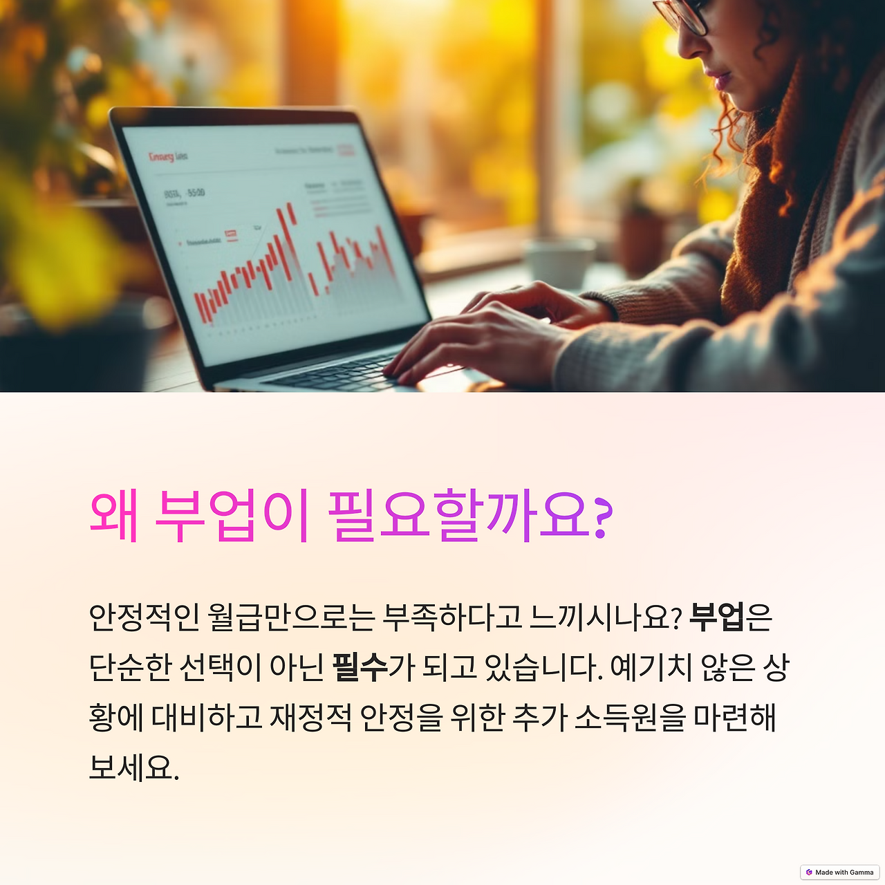 | 미래 대비 및 재정적 독립 | 직장 생활이 영원히 보장되지 않습니다. 부업을 통해 새로운 수입원을 마련하면 만약의 상황에도 대비할 수 있습니다. |