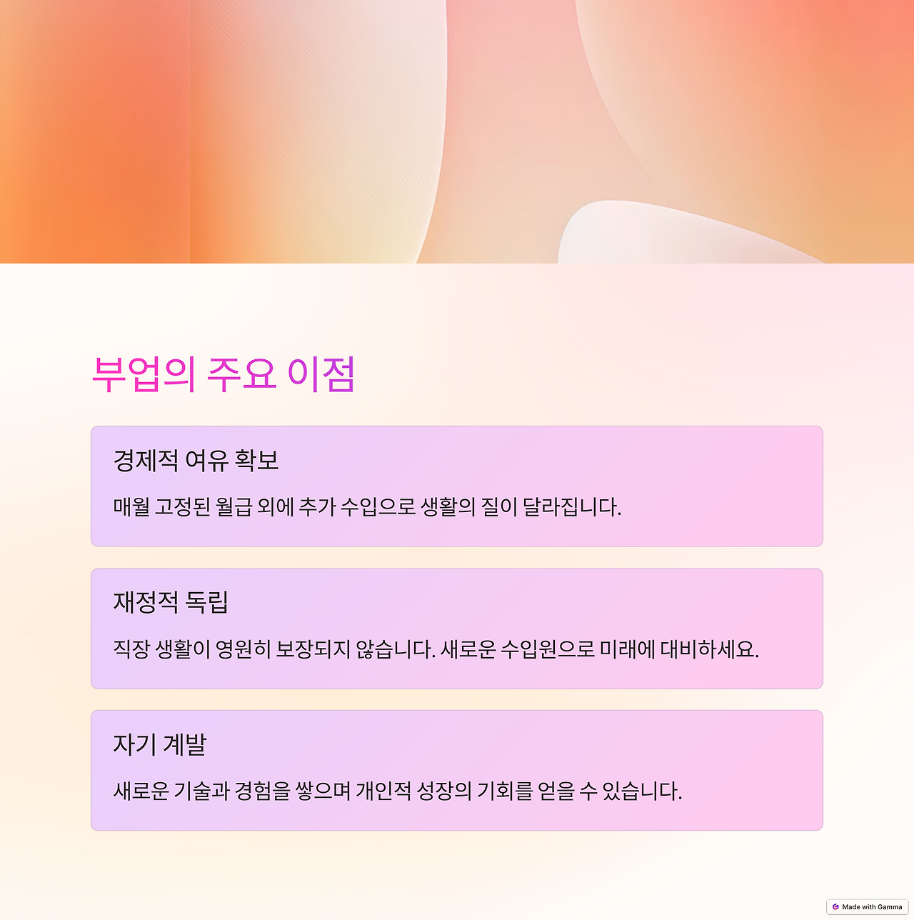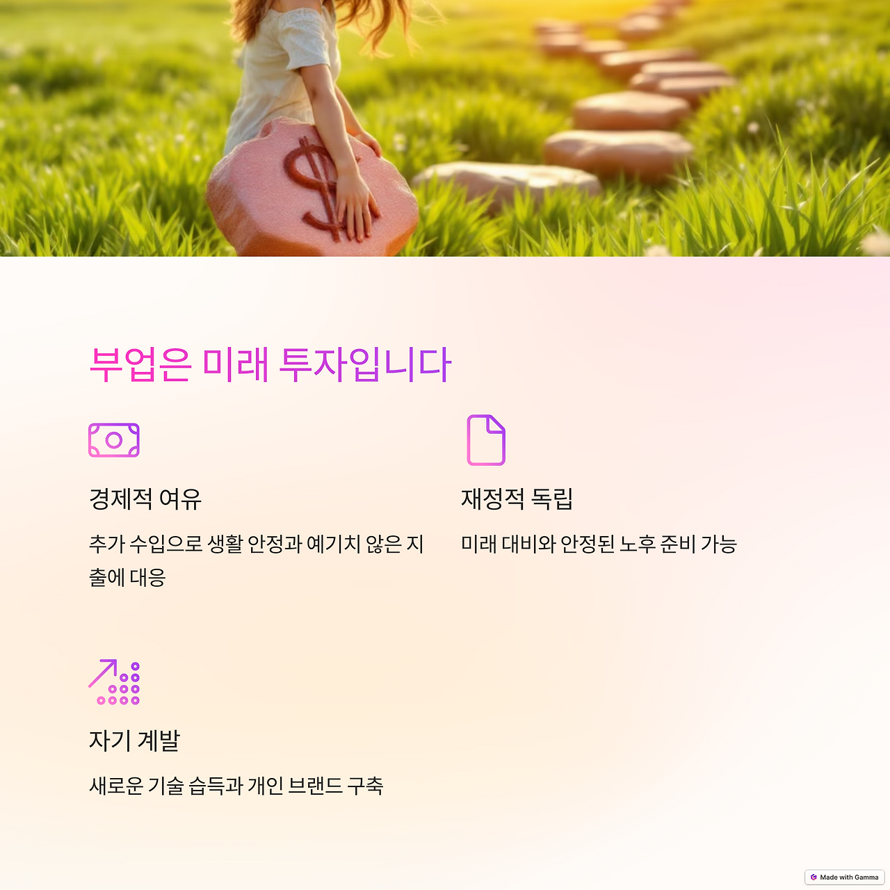 | 추가 수입으로 생활 안정 | 미래 대비 가능 | 새로운 기술 습득 |