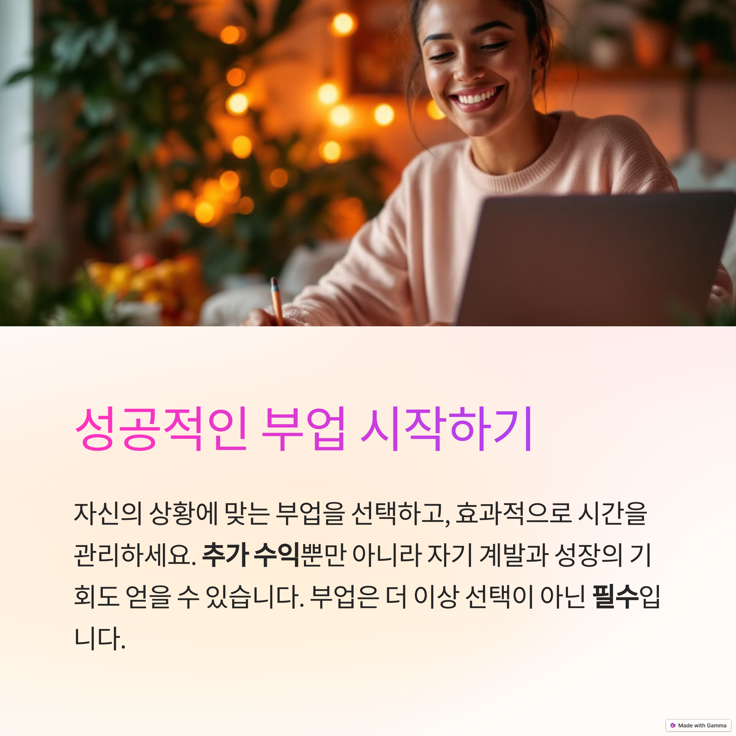 부업은 직장인에게 추가 수익 창출과 개인적 성장을 동시에 제공할 수 있는 좋은 기회입니다. 자신에게 맞는 부업을 선택하고 철저한 시간 관리와 전략적 접근을 통해 성공적인 부업을 시작해 보세요. 꾸준함과 노력이 가장 중요한 성공 요소입니다.