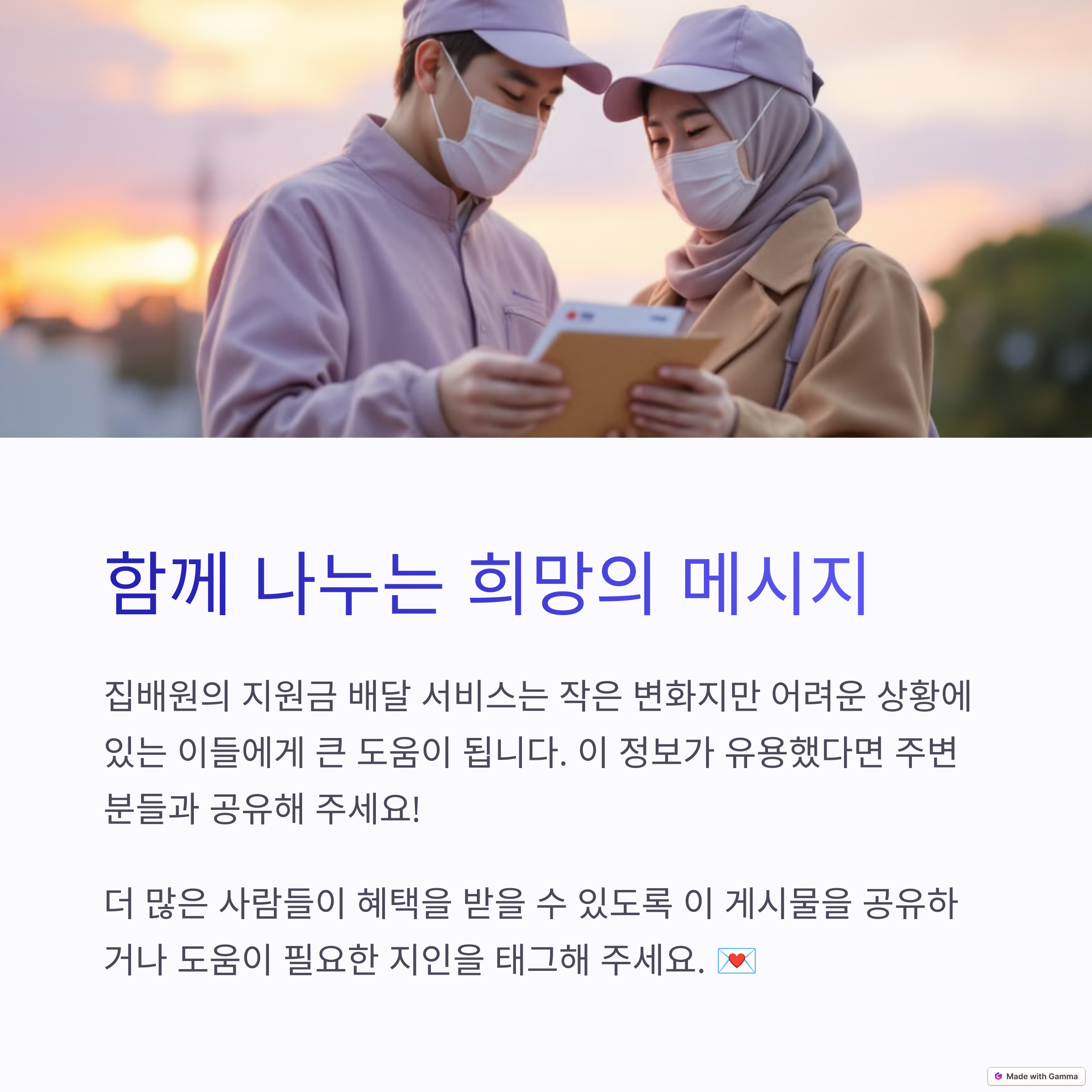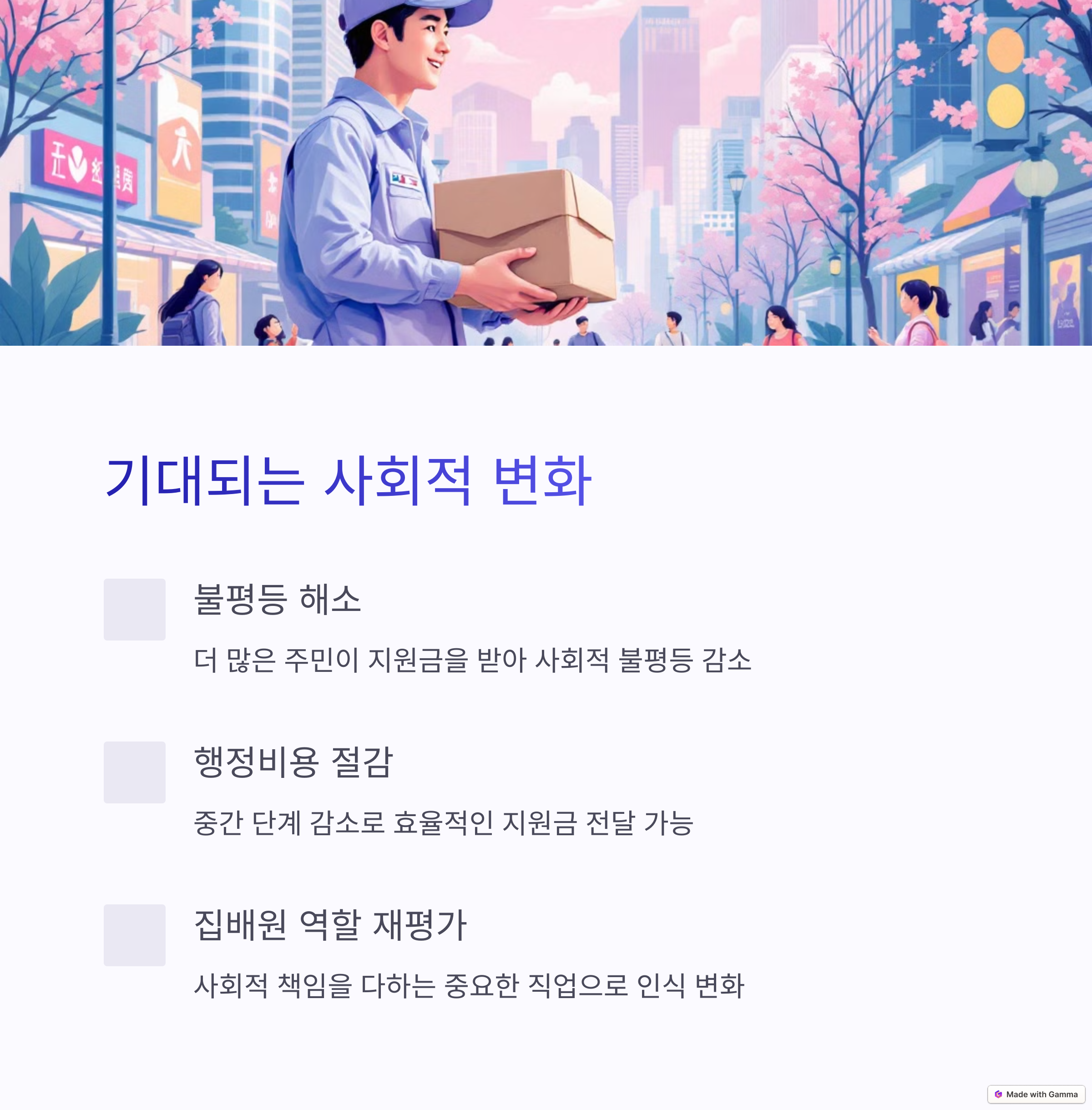집배원이 지자체 지원금을 직접 배달하는 새로운 시스템은 여러 면에서 긍정적인 변화를 가져옵니다. 지원금이 필요한 사람들에게 빠르고 정확하게 전달되며, 사회적 약자도 누락되지 않고 혜택을 받을 수 있습니다. 앞으로 이 서비스가 확대되면, 집배원은 단순한 배달자가 아니라, 주민의 삶에 실질적인 도움을 주는 중요한 존재로 자리 잡을 것입니다. 이러한 변화는 우리 사회의 더 나은 미래를 위한 중요한 첫걸음이 될 것입니다.