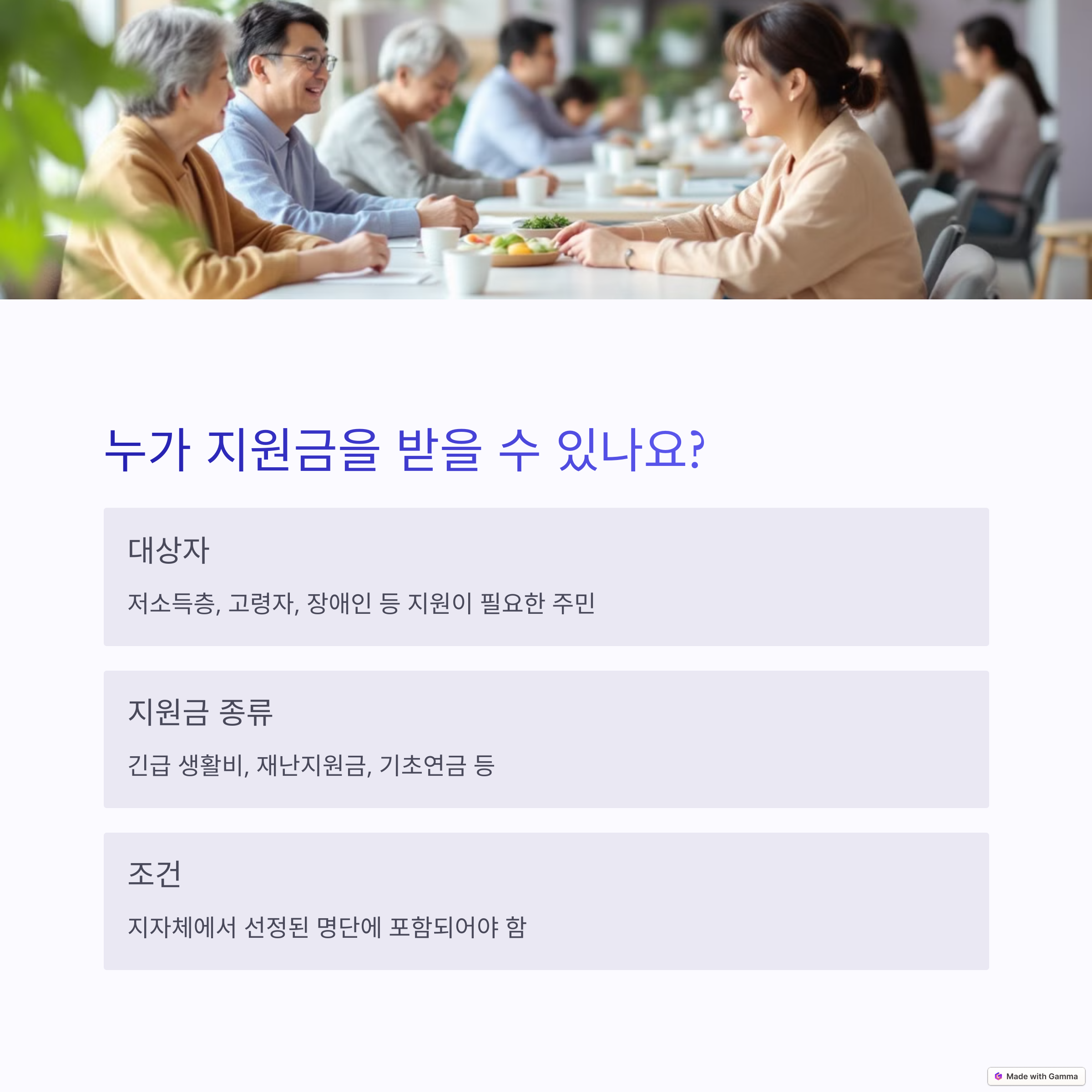 주로 저소득층, 고령자, 장애인 등 지원이 필요한 주민이 대상이 되며, 지자체에서 선정된 명단에 올라야 합니다.