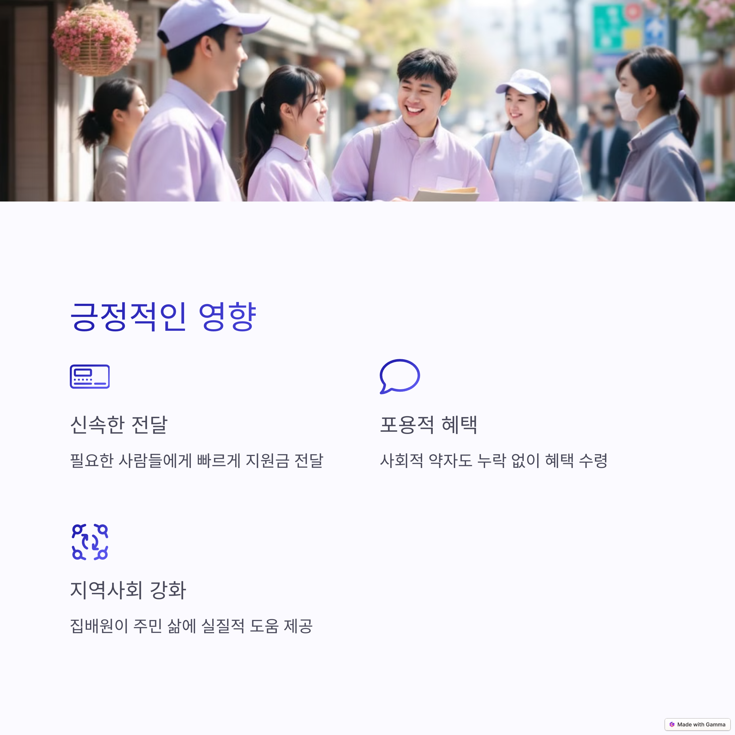 사회적 약자 지원 강화: 고령자나 장애인을 비롯한 사회적 약자들이 은행이나 다른 기관을 방문하는 것이 어려운 경우, 집배원은 이들의 집까지 직접 방문하여 지원금을 전달해 줍니다. 이로 인해 혜택이 고루 퍼질 수 있습니다.