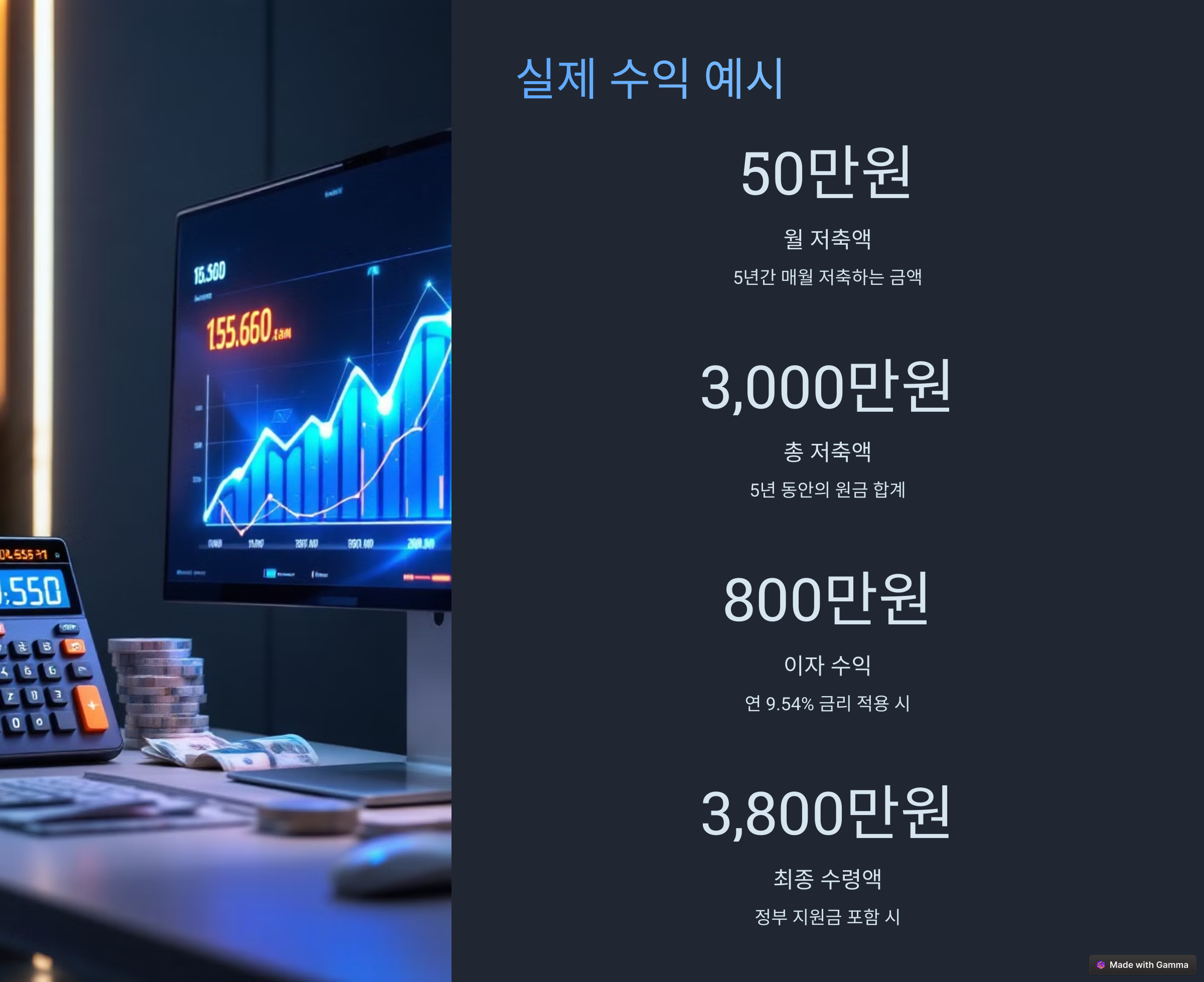 예를 들어 매월 50만 원씩 5년 동안 저축할 경우, 총 저축 금액은 3,000만 원입니다. 여기에 연 9.54% 금리를 적용하면 총이자 수익은 약 800만 원이며, 정부 매칭 지원금까지 포함되면 만기 시 최종 수령액은 약 3,800만 원에 달합니다. 이는 일반 예적금 상품과 비교했을 때 두 배 가까운 수익을 얻을 수 있는 기회입니다.