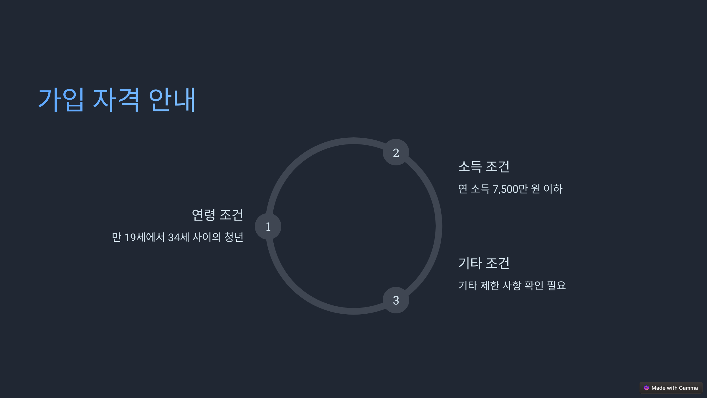 | 가입 대상 | 만 19세에서 34세의 연 소득 7,500만 원 이하 청년 |