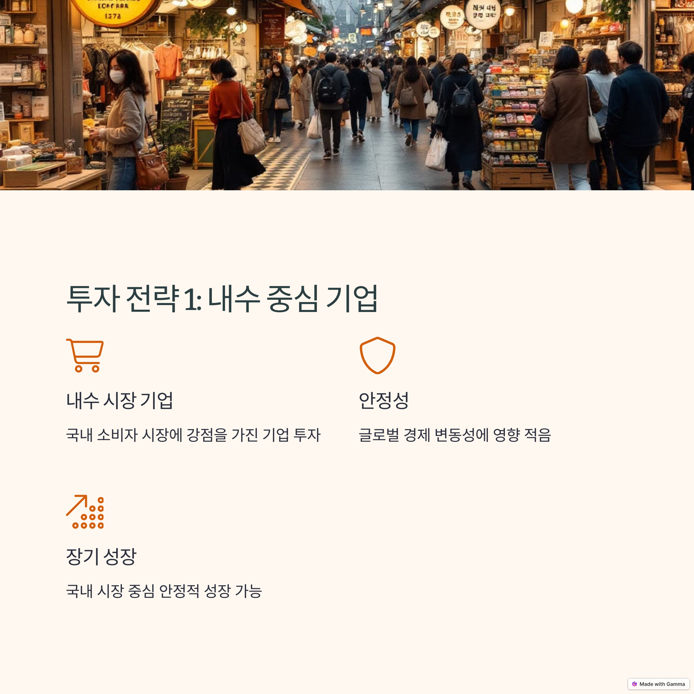 그렇다면 미국의 관세 정책 변화에 대한 대응 전략은 어떻게 마련할 수 있을까요? 첫 번째로, 글로벌 수출 비중이 높은 기업들보다는 내수 시장 비중이 높은 기업에 투자하는 방법이 있습니다. 예를 들어, 국내 소비자 시장에 강점을 가진 기업이나, 해외 의존도가 낮은 산업군을 중심으로 포트폴리오를 조정하는 것입니다. 내수 시장 중심의 기업들은 글로벌 경제의 변동성에 상대적으로 영향을 덜 받을 수 있기 때문에 안정적인 투자처가 될 수 있습니다.