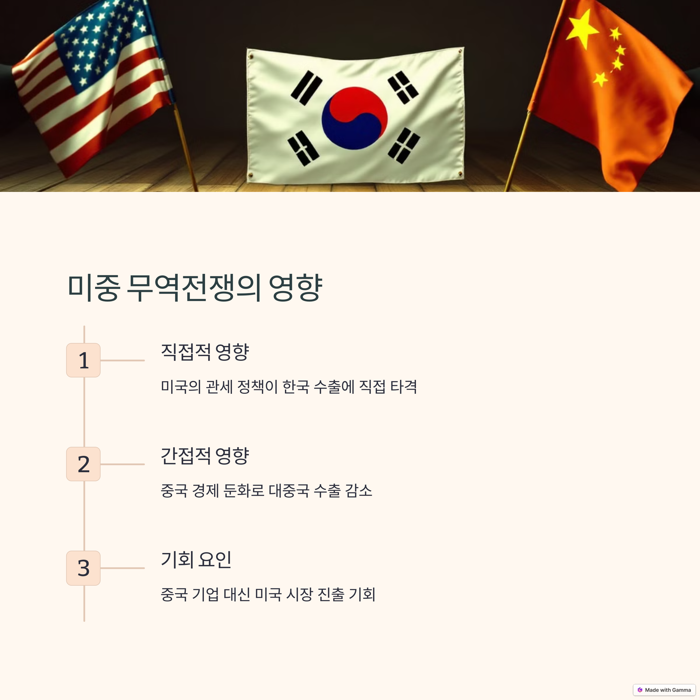 이 경우, 한국의 대중국 수출 기업들은 물론이고, 중국 내 제조 기반을 갖춘 기업들 역시 영향을 받을 수 있습니다. 예를 들어, 중국에 공장이 있는 한국 기업들은 원자재 가격 상승과 같은 부정적인 영향을 받을 수 있으며, 이는 한국 증시의 하락 요인으로 작용할 수 있습니다. 반대로, 미중 갈등으로 인해 중국 기업들이 미국 시장에서 어려움을 겪는다면, 한국 기업들이 그 빈자리를 채울 수 있는 기회가 될 수 있습니다.
