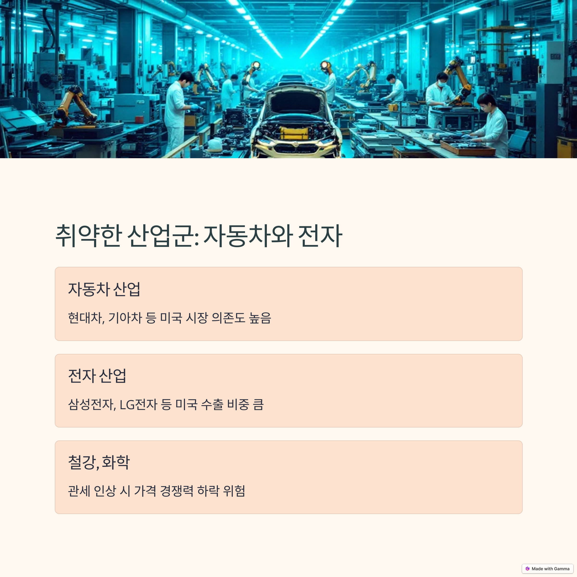 한국의 주요 산업군 중에서, 자동차, 전자, 철강, 화학 산업이 큰 비중을 차지하고 있습니다. 미국이 해당 산업에 대해 높은 관세를 부과한다면, 수출에 큰 타격을 입을 수 있습니다. 특히, 한국의 자동차 및 전자 기업들은 미국 시장 의존도가 높기 때문에, 관세 인상은 판매 가격을 높이고, 소비자들에게는 가격 부담을 주어 판매량에 직접적인 영향을 미칠 수 있습니다. 이에 따라, 한국 증시에서 이러한 산업에 대한 주식들은 단기적인 하락 압박을 받을 수 있습니다.