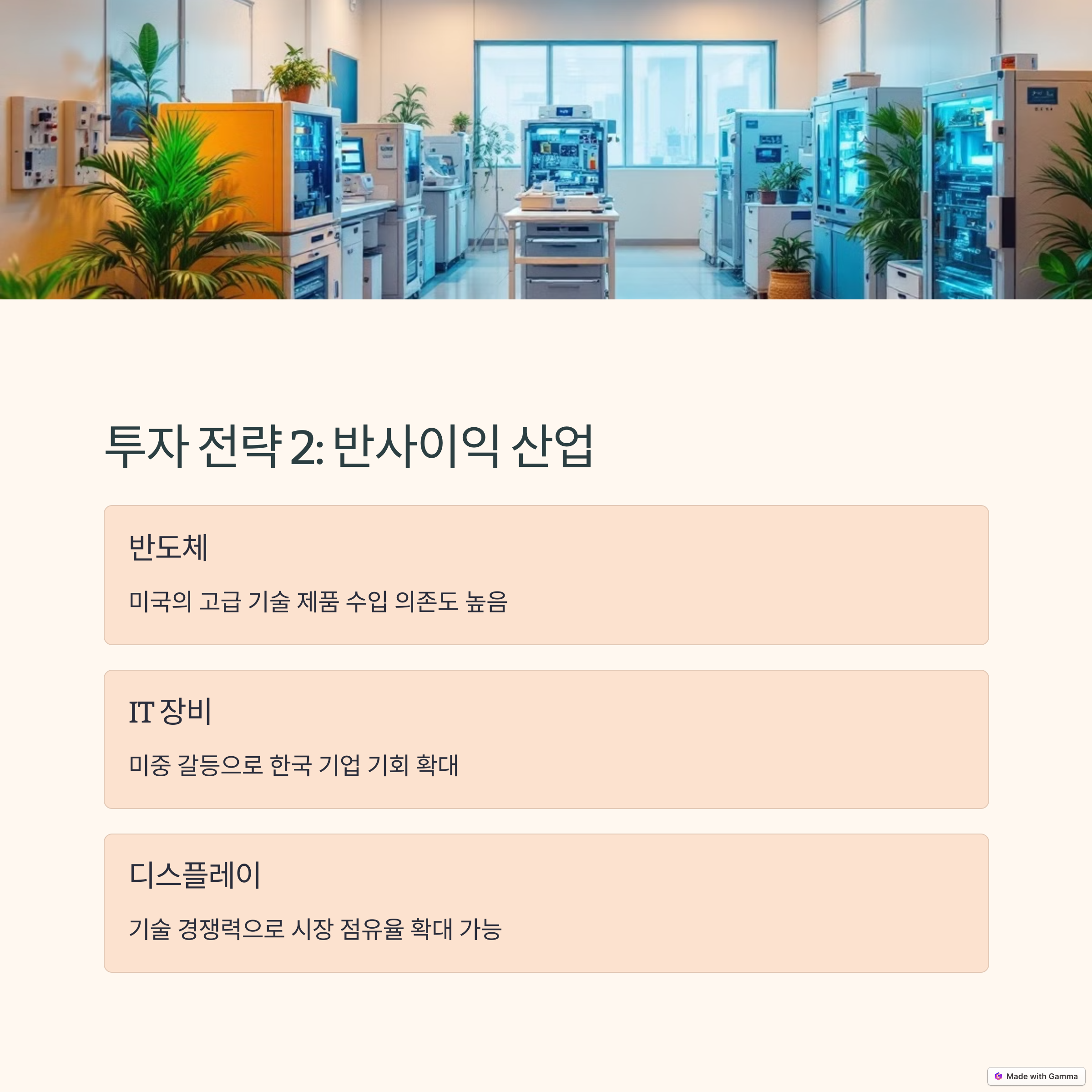 두 번째로, 미국의 관세 정책 변화에 따른 반사이익을 얻을 수 있는 기업들을 주목해야 합니다. 미국의 고율 관세로 인해 타국의 공급망에서 문제를 겪고 있는 산업들은 오히려 한국 기업에게 기회가 될 수 있습니다. 예를 들어, 반도체나 IT 장비, 디스플레이 등의 산업은 미국과의 무역 관계에서 긍정적인 영향을 받을 수 있습니다. 특히, 미국은 반도체와 같은 고급 기술 제품을 많이 수입하기 때문에, 이 분야에서 한국 기업들이 수출을 확대할 수 있는 기회를 가지게 될 것입니다.