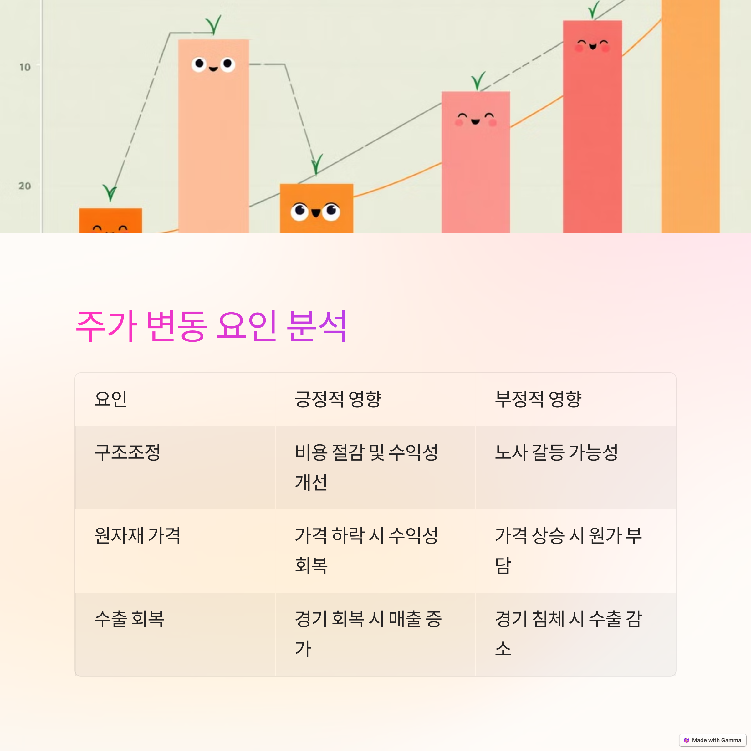 - 단기 전망: 구조조정 및 인력 감축에 따른 일시적인 노사 갈등으로 주가 변동성이 클 수 있습니다.