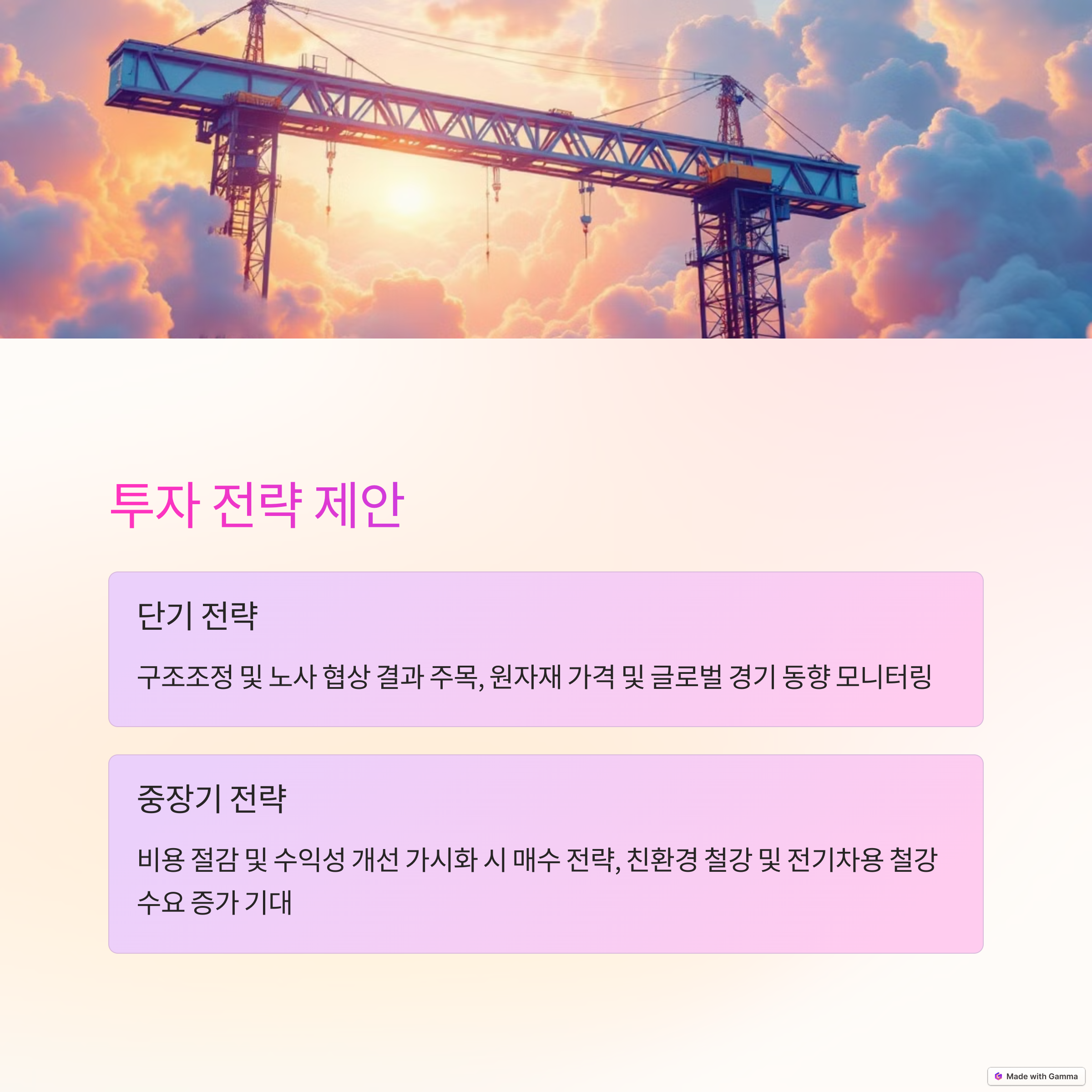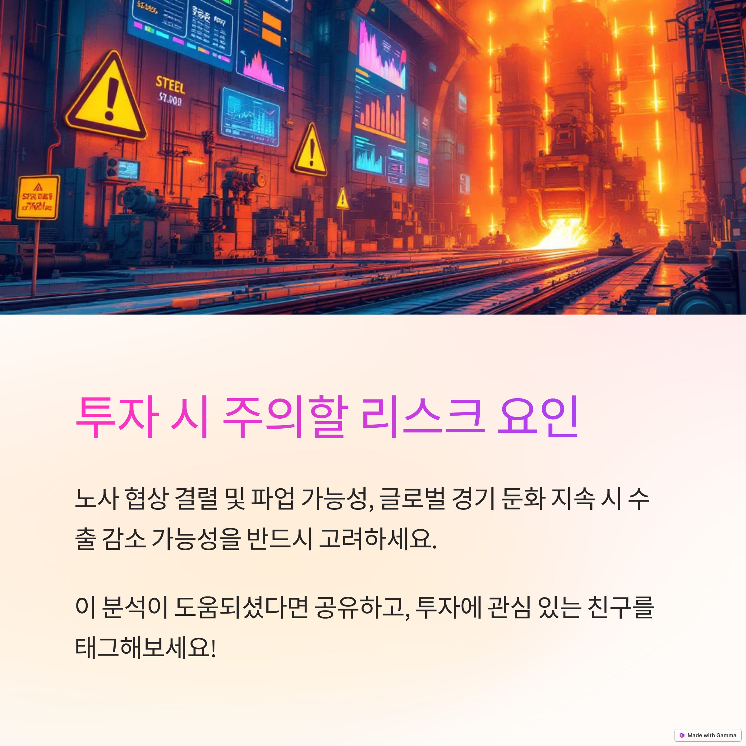 | 신규 사업 | 친환경 철강 및 전기차용 철강 수요 증가 기대 | 초기 투자 비용 증가 |