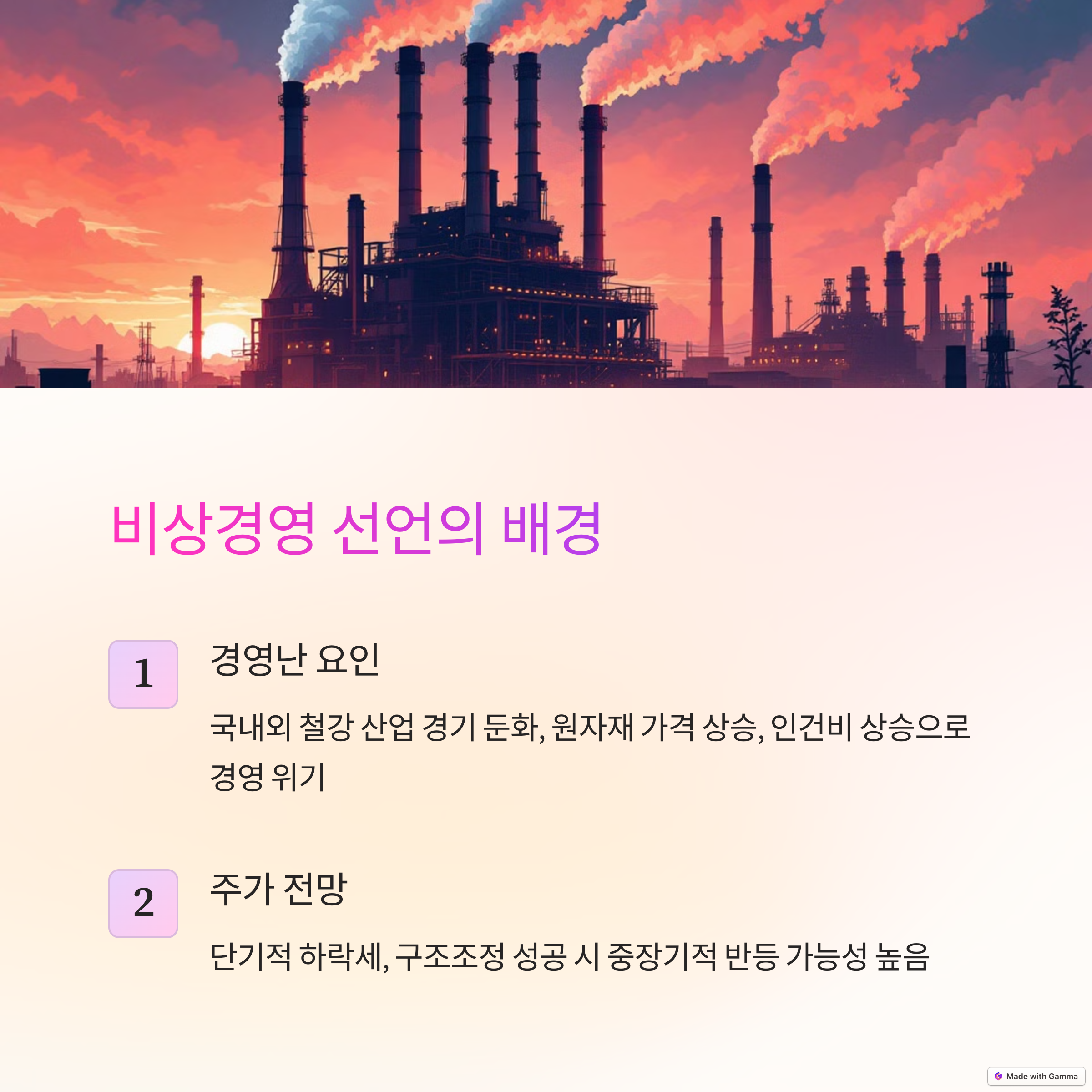 최근 현대제철이 비상경영을 선언하면서 주식 시장에서 큰 주목을 받고 있습니다. 현대제철은 국내외 철강 산업의 경기 둔화와 원자재 가격 상승, 인건비 상승 등의 요인으로 경영난을 겪고 있습니다. 이에 따라 현대제철의 주가는 단기적으로 하락세를 보이고 있지만, 구조조정 및 원가 절감이 성공할 경우 중장기적으로는 반등 가능성이 높다는 평가가 나오고 있습니다. 이번 분석에서는 현대제철의 비상경영 선언 배경, 주가 변동 요인, 전문가들의 전망 및 투자 전략까지 자세히 살펴보겠습니다.