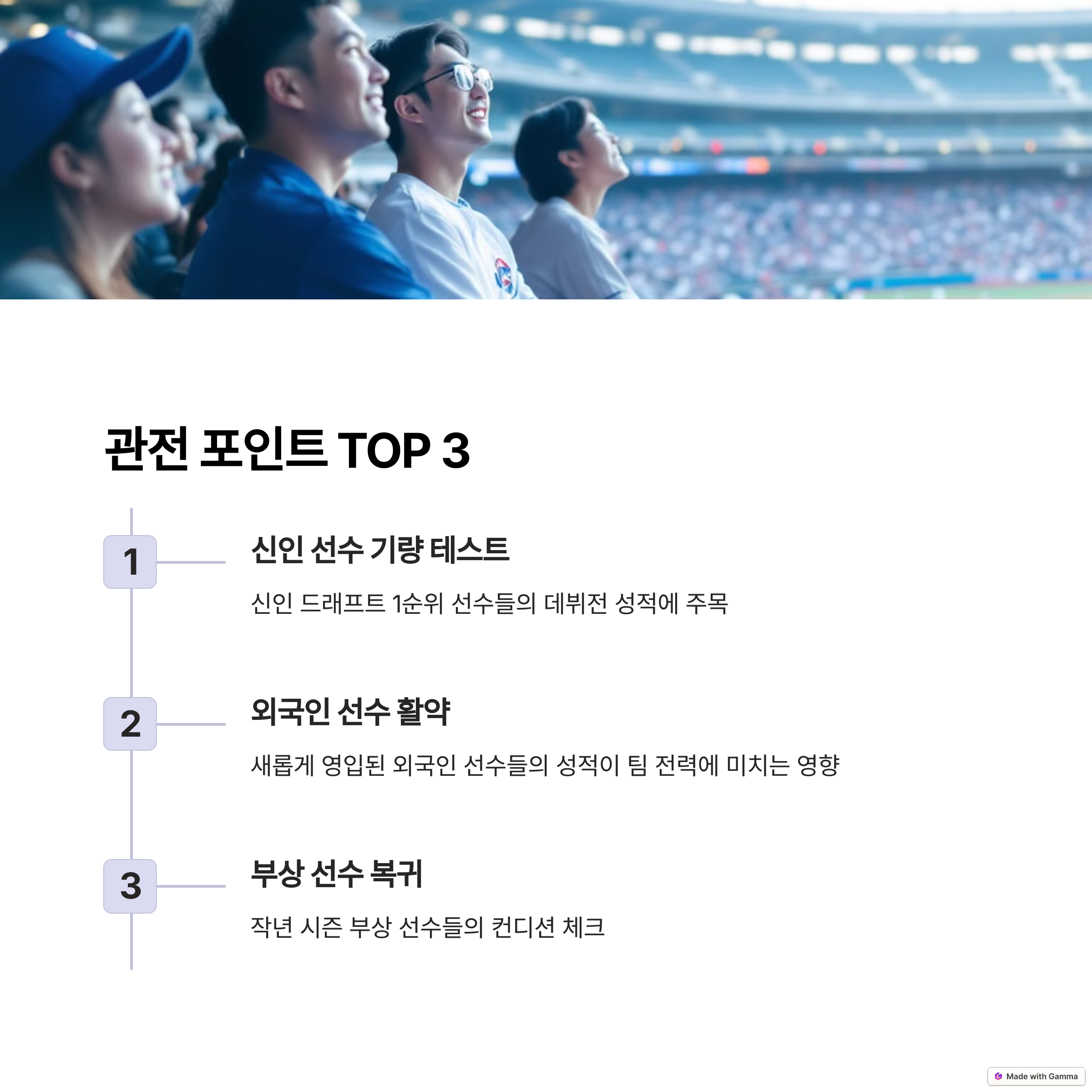 시범경기에서는 기량 점검뿐만 아니라 팀 간의 심리전도 펼쳐집니다. 특히 팀별 주요 선수들의 컨디션과 신인 선수의 활약상이 팬들의 관심을 모을 것입니다.
