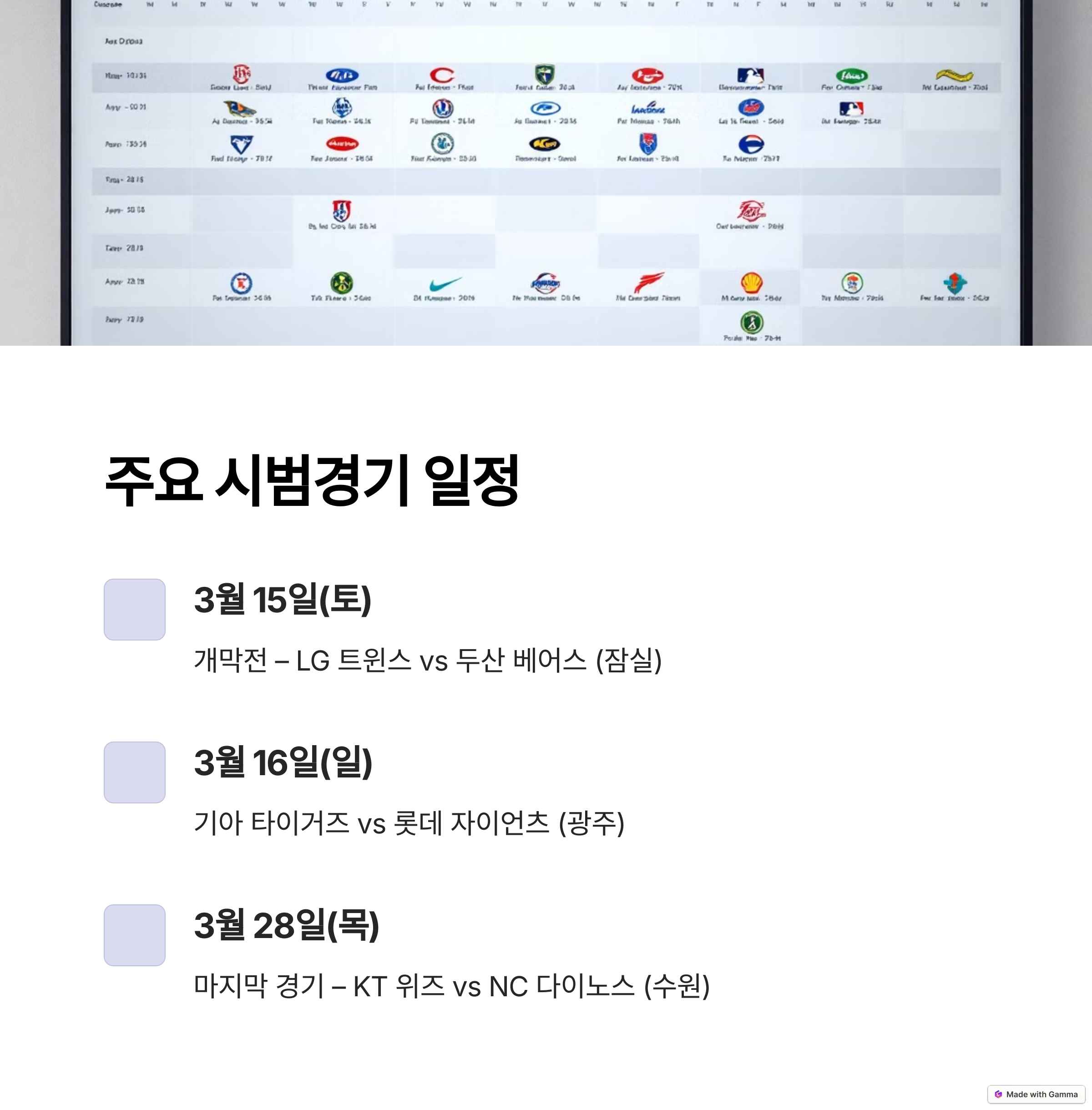 특히 시범경기 일정은 팬들에게도 중요한 의미를 갖습니다. 시범경기를 통해 올해 각 팀의 전력을 미리 점검하고, 정규 시즌에 대한 기대감을 키울 수 있습니다. 다음은 2025년 KBO 시범경기 주요 일정입니다.