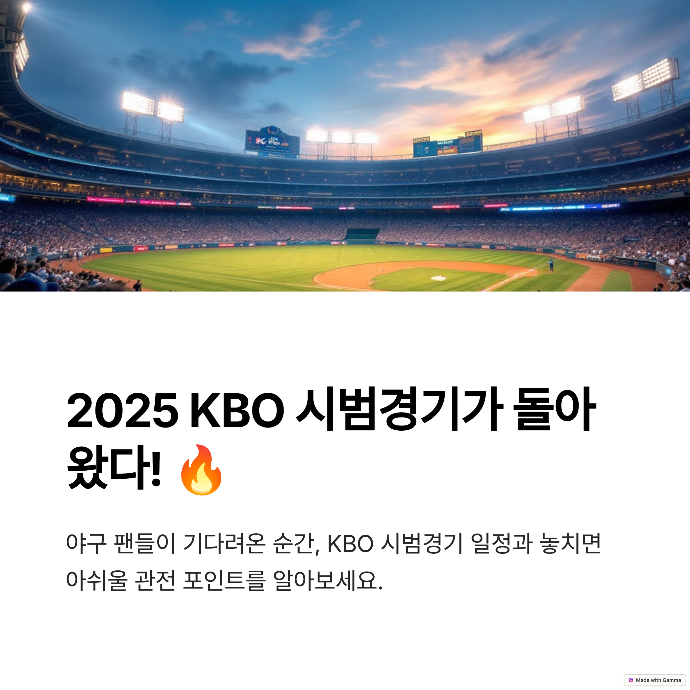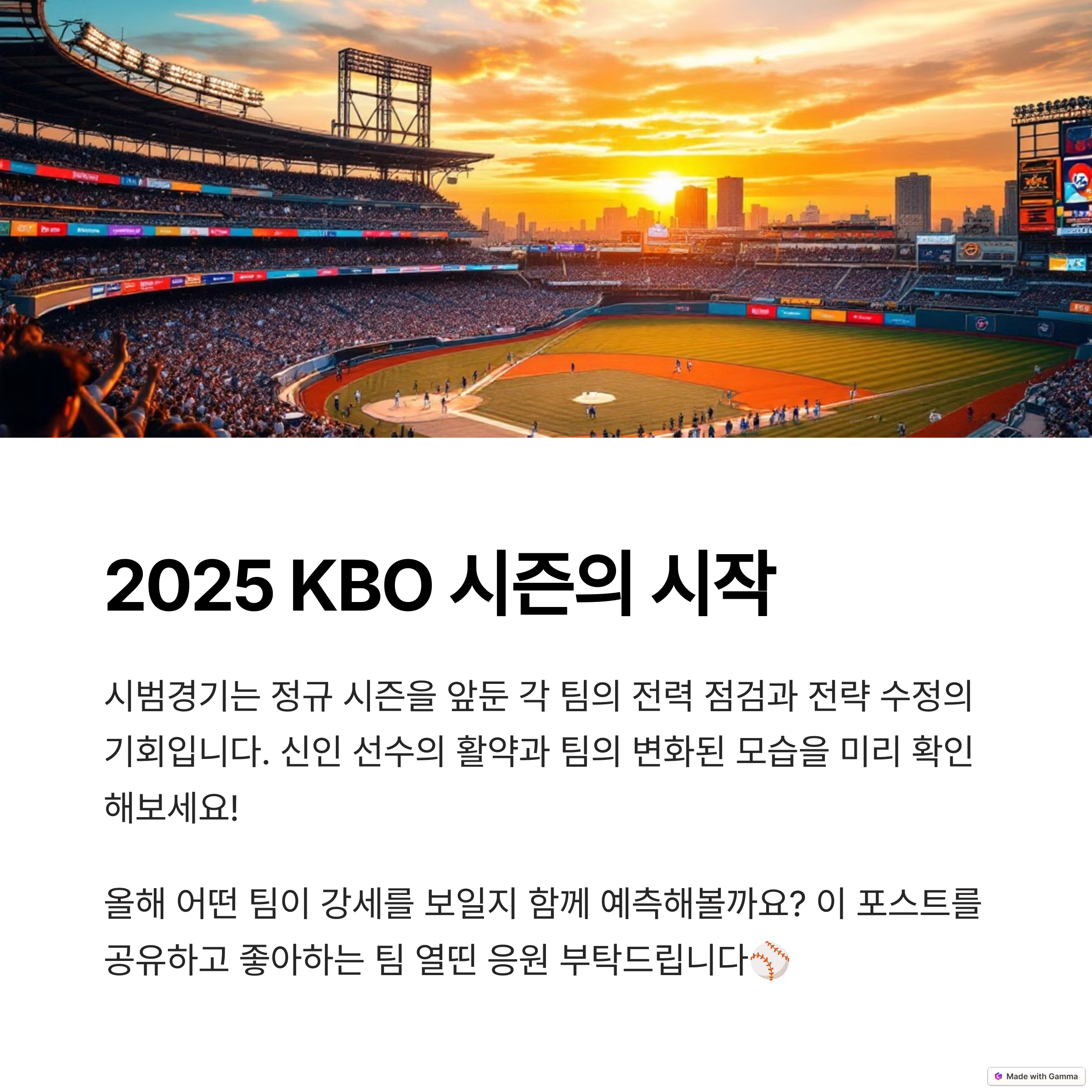 2025년 KBO 시범경기가 드디어 개막합니다! 야구팬들이 손꼽아 기다리던 시범경기는 정규 시즌의 전초전으로, 팀별 전력 점검 및 신예 선수들의 활약을 미리 확인할 수 있는 기회입니다. 이번 글에서는 2025년 KBO 시범경기 일정과 관전 포인트, 그리고 놓치면 아쉬울 주요 이슈들을 자세히 소개해 드립니다.