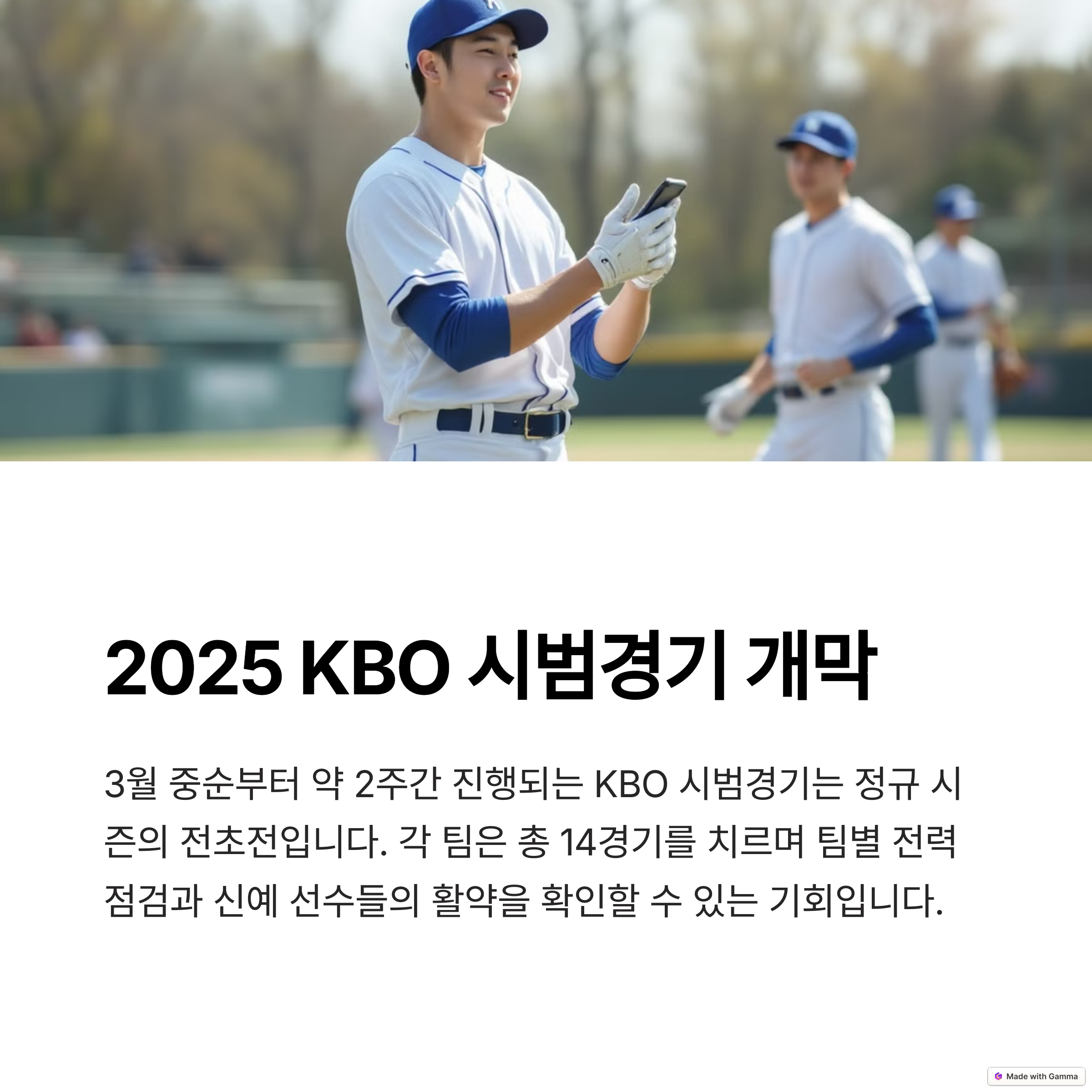 2025년 KBO 시범경기는 3월 중순부터 약 2주간 진행될 예정입니다. 시범경기는 정규 시즌을 앞두고 팀별 전력을 점검하고, 새로운 선수들의 기량을 테스트할 수 있는 중요한 기회입니다. 각 팀은 총 14경기를 치르게 되며, 홈 구장 및 원정 구장에서 팬들과 함께 호흡할 수 있습니다.
